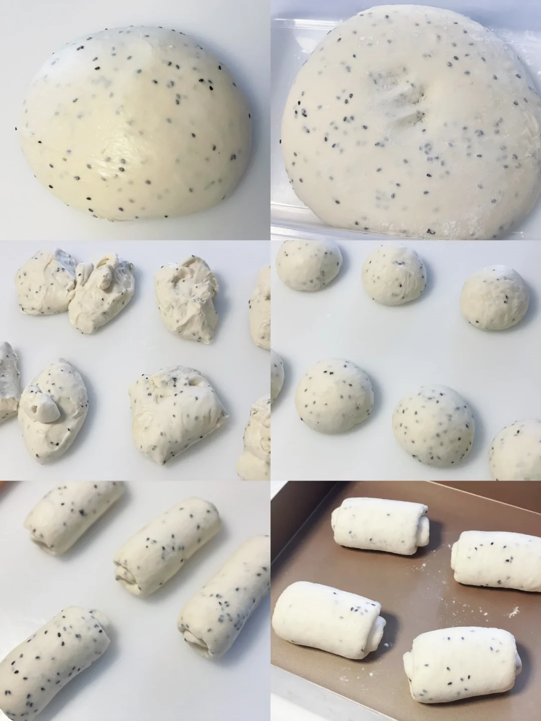 主面团:137g高筋面粉|9g盐|10g糖|18g奶粉|4g鲜酵母|23g蛋液|47g牛奶|60g水|32g黄油|13g黑芝麻