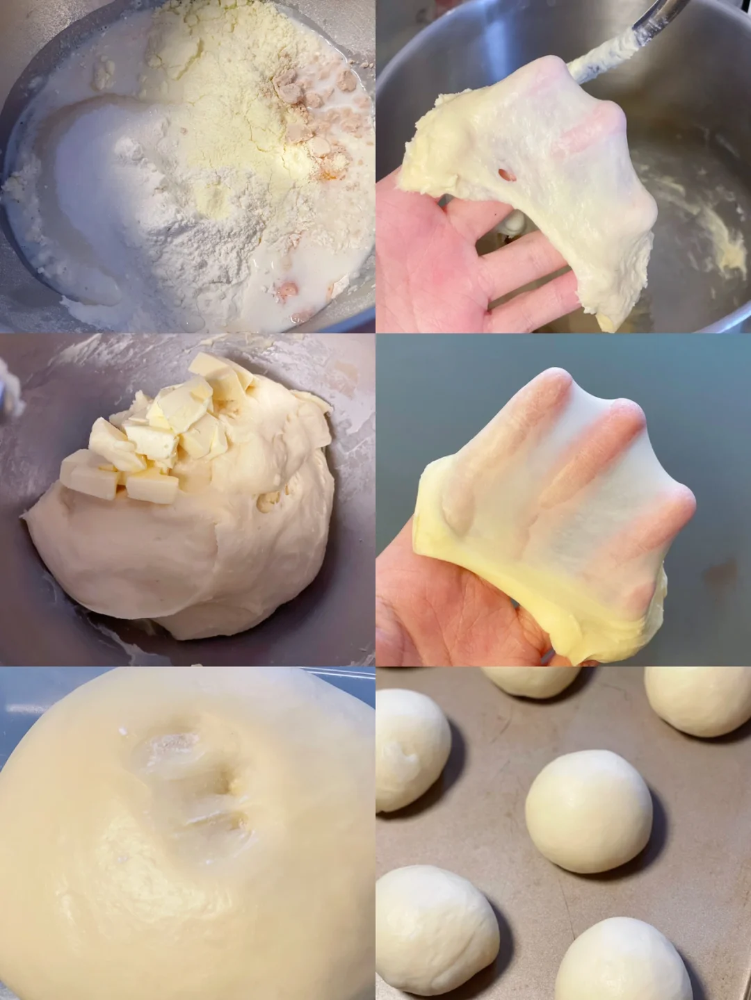 1⃣️除黄油所有材料加入搅拌缸,低速混合无干粉转6档打至有厚膜八分筋;加入黄油,3档混合均匀后转高速打至完全阶段