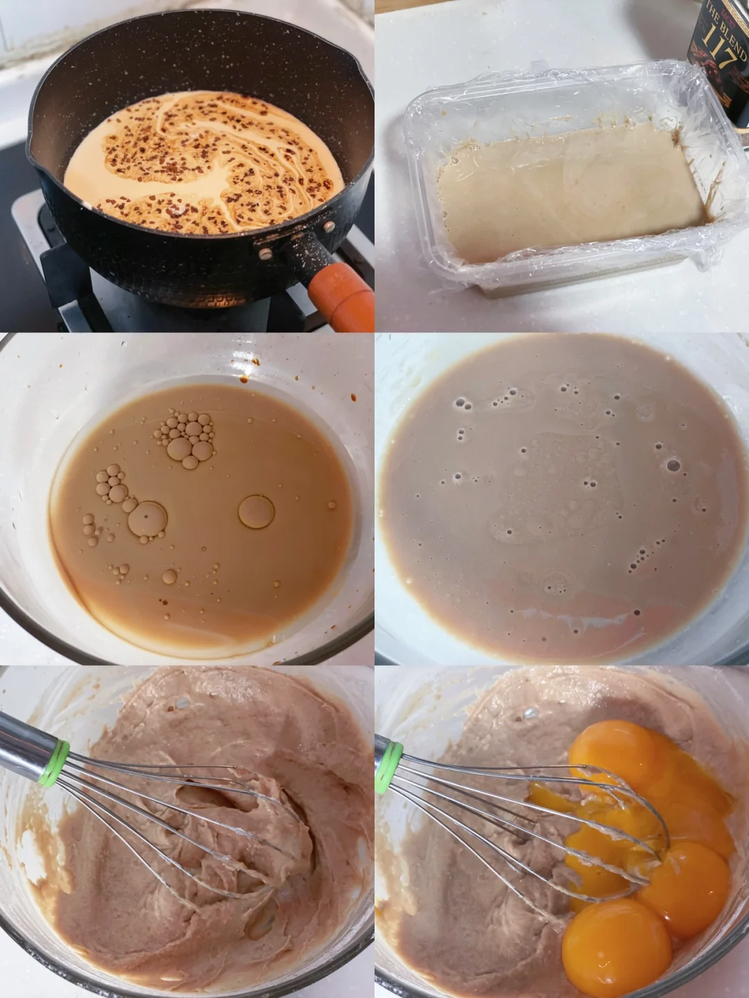 1⃣️制作奶冻:将牛奶淡奶油咖啡粉糖倒入锅中搅拌均匀小火煮沸,吉利丁片冷水泡软挤干水份加入,搅拌均匀倒入保鲜盒密封冷藏过夜