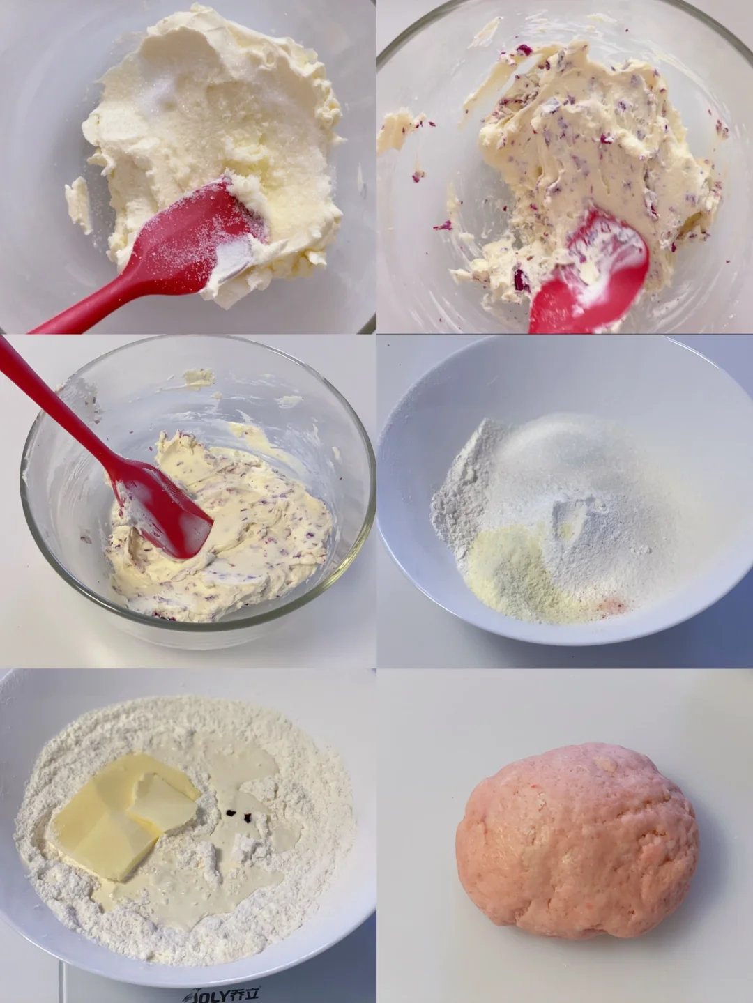 1⃣️制作乳酪馅,奶油奶酪+糖拿刮刀搅拌顺滑,再放入玫瑰花瓣搅拌均匀装入裱花袋备用