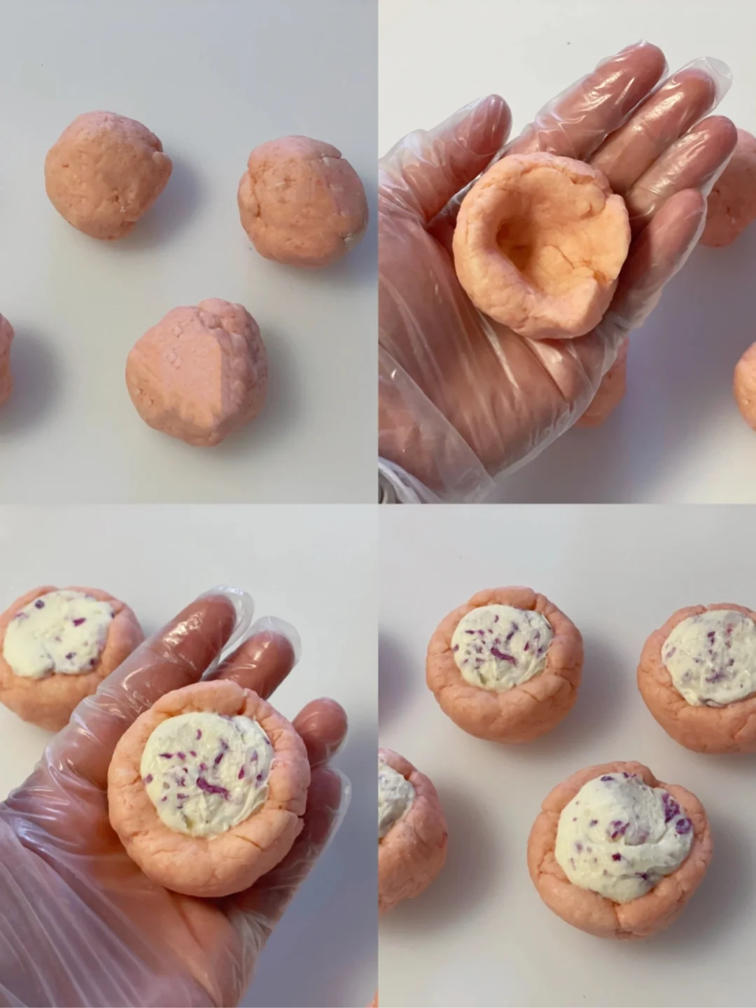 4⃣️均分五份约50g一个球,用手捏出碗状,挤入适量的乳酪馅,再用虎口略微收口