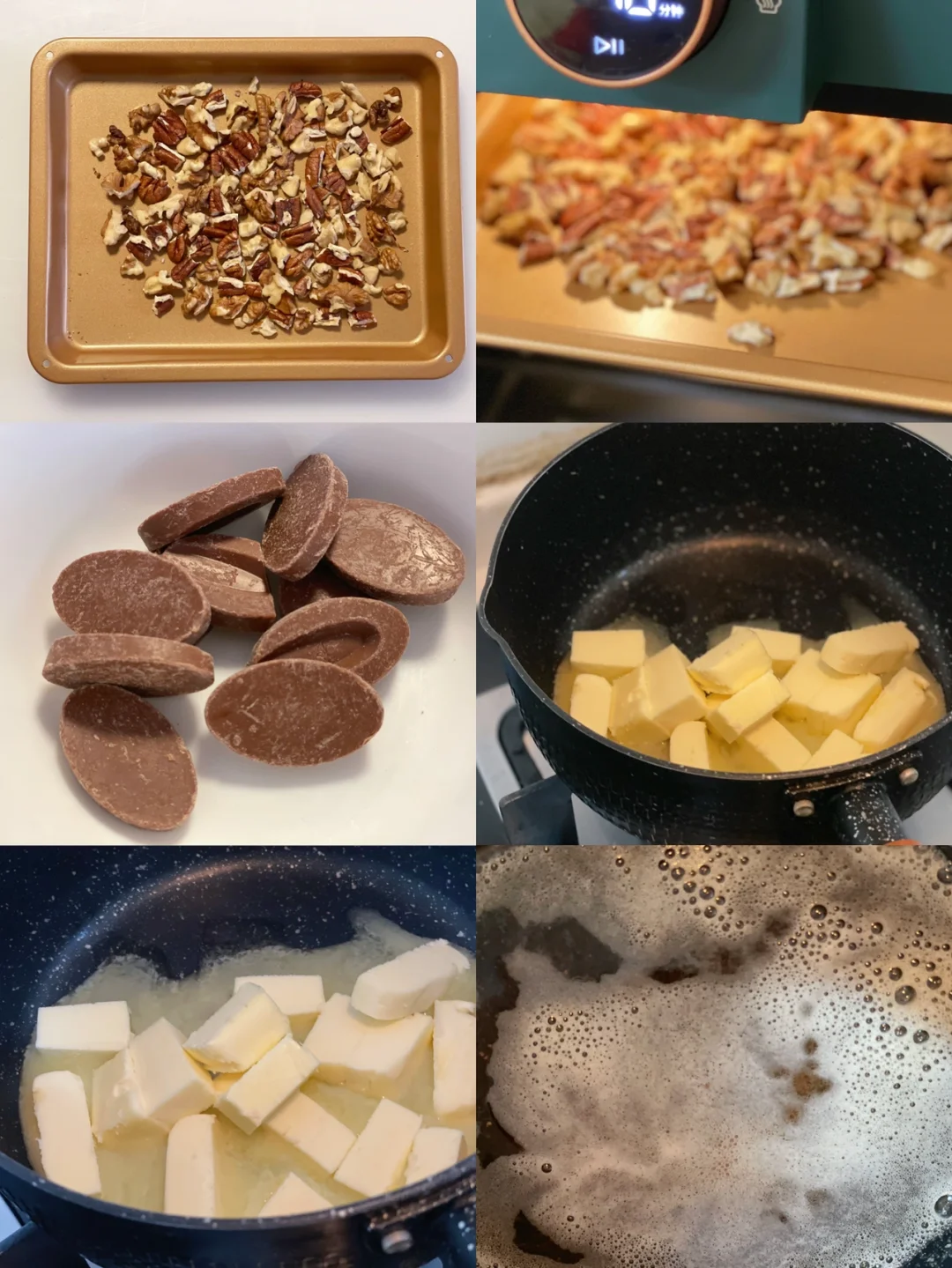 1⃣️145g黄油切成小块放入小锅,剩下55g放一旁。核桃碎150度10分钟烤香,巧克力切碎备用。