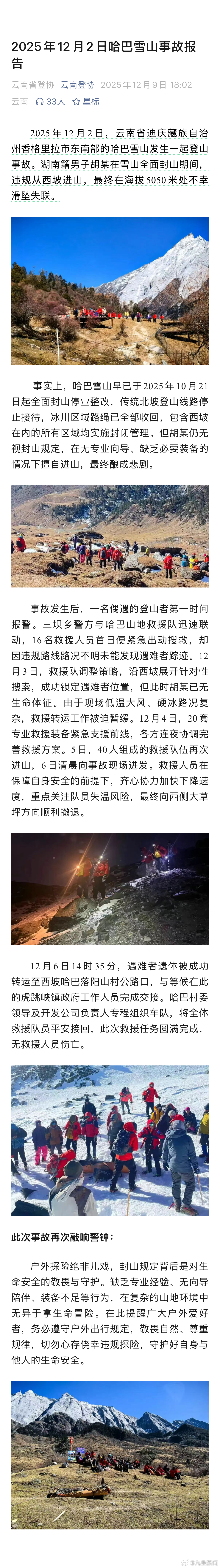 #男子封山期间进哈巴雪山坠亡#【#云南登协通报男子进哈巴雪山坠亡#:遗体已被转运下山】12月9日,云南登山协会发布事故报告称,2025年12月2日,云南省迪庆藏族自治州香格里拉市东南部的哈巴雪山发生一起登山事故。湖南籍男子胡某在雪山全面封山期间,违规从西坡进山,最终在海拔5050米处不幸滑坠失联。事实上,哈巴雪山早已于2025年10月21日起全面封山停业整改,传统北坡登山线路停止接待,冰川区域路绳已全部收回,包含西坡在内的所有区域均实施封闭管理。但胡某仍无视封山规定,在无专业向导、缺乏必要装备的情况下擅自进山,最终酿成悲剧。事故发生后,一名偶遇的登山者第一时间报警。三坝乡警方与哈巴山地救援队迅速联动,16名救援人员首日便紧急出动搜救,却因违规路线路况不明未能发现遇难者踪迹。12月3日,救援队调整策略,沿西坡展开针对性搜索,成功锁定遇难者位置,但此时胡某已无生命体征。由于现场低温大风、硬冰路况复杂,救援转运工作被迫暂缓。12月4日,20套专业救援装备紧急支援前线,各方连夜协调完善救援方案。5日,40人组成的救援队伍再次进山,6日清晨向事故现场进发。救援人员在保障自身安全的前提下,齐心协力加快下降速度,重点关注队员失温风险,最终向西侧大草坪方向顺利撤退。12月6日14时35分,遇难者遗体被成功转运至西坡哈巴落阳山村公路口,与等候在此的虎跳峡镇政府工作人员完成交接。哈巴村委领导及开发公司负责人专程组织车队,将全体救援队员平安接回,此次救援任务圆满完成,无救援人员伤亡。
