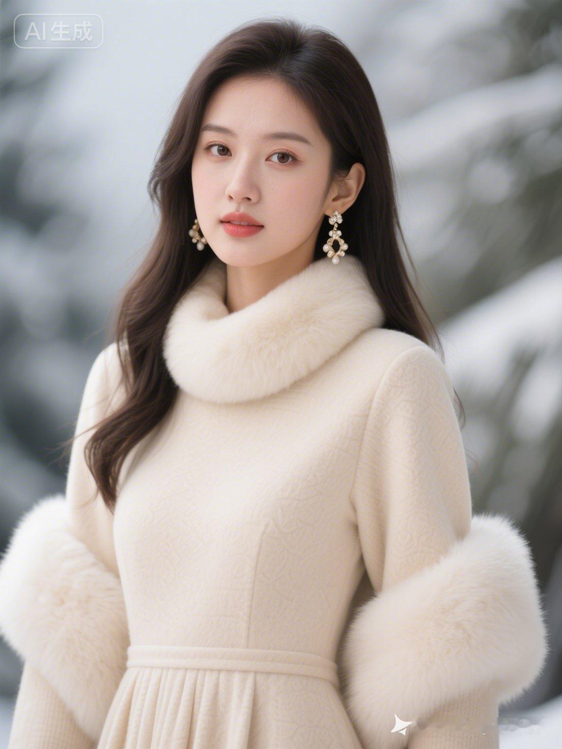 冬日暖阳下的温柔雪景,白色毛绒外套与少女般纯净的笑容相得益彰。