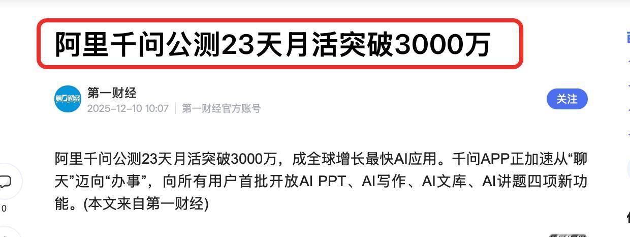 刷到一个爆炸性新闻,仅用23天,阿里千问就突破了3000万,背后有个重要的信息很多人都没看到。 说实话,一开始看到这个消息还是比较意外,按照这个增长速度看下来,千问是全球增长最快的。 为此专门去研究了一下,可真是不看不知道,一看让人大吃一惊! 总结来说,阿里千问之所以增长这么猛,主要还是解决实际问题的能力超乎寻常的强。 大家日常工作现在最难的点就是办公软件方面不兼容,比如要做个PPT,先要收集整理资料,理顺逻辑,然后再到排版格式,最好找模板,有的还要花钱,一套流程下来,没有大几个小时根本不行, 但千问就不一样了,直接打响了“办事第一枪”,直接升级了学习和办公的能力。 现在通过千问做PPT,你甚至可以给它输入一句话,就能生产PPT,生成之后的PPT哪儿需要修改,直接通过对话告诉它就可以搞定了。 千问的这个办公能力,好就好在过去可能需要多个软件跳转的活儿,现在一个应用就可以搞定,并且还是完全免费,没有任何套路。 千问能做到这一点,仔细研究了一下,两方面的原因,。 第一:千问的技术基础很扎实,实力很强。毕竟在开源大模型榜单中,阿里千问大模型可是对硅谷实现了屠榜,是世界第一的开源大模型。 第二:阿里非常关注用技术解决现实生活中的问题,一直在力推科技普惠,千问个人AI助手集中体现了这个能力。 另外,值得一提的是,当前阿里千问的能力仅仅是通过23天技术迭代达到的水平,按照这个趋势来看,随着时间的推移,阿里千问发展下去,未来不可限量!