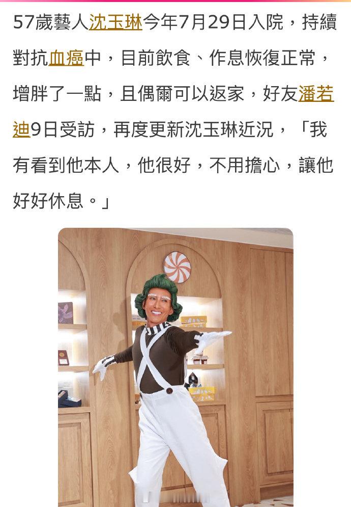 好友透露沈玉琳病况 据台媒,沈玉琳好友潘若迪 9 日接受采访时,再度更新沈玉琳近况,“我有见到他本人,他状态很好,大家不用担心,让他安心好好休息就好。”,好友表示自己每天都会通过视频电话关心对方“他大概过年前就能回家,肯定可以的”。