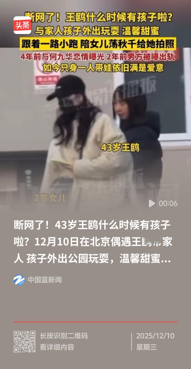 12月10日,有网友在公园偶遇王鸥带女儿游玩。当天阳光很好,王鸥穿着灰色运动外套、戴着鸭舌帽和口罩,素颜的她眉眼温柔。身边一两岁多的小娃娃穿着粉色上衣,扎着冲天辫,踩着小熊袜子,可爱极了。 王鸥专门给孩子穿了“防走失”背带,全程紧跟。孩子精力旺盛围着滑梯跑,王鸥就在后面小跑;孩子玩秋千,她一边拍照一边推,眼神满是母爱。 孩子生父疑是何九华,二人曾多次被拍到同框。王鸥早年还陷入过“夜光剧本”事件,如今何九华又被曝孕期出轨,只能说娱乐圈的事儿真是复杂啊。 王鸥 王鸥演技进化史