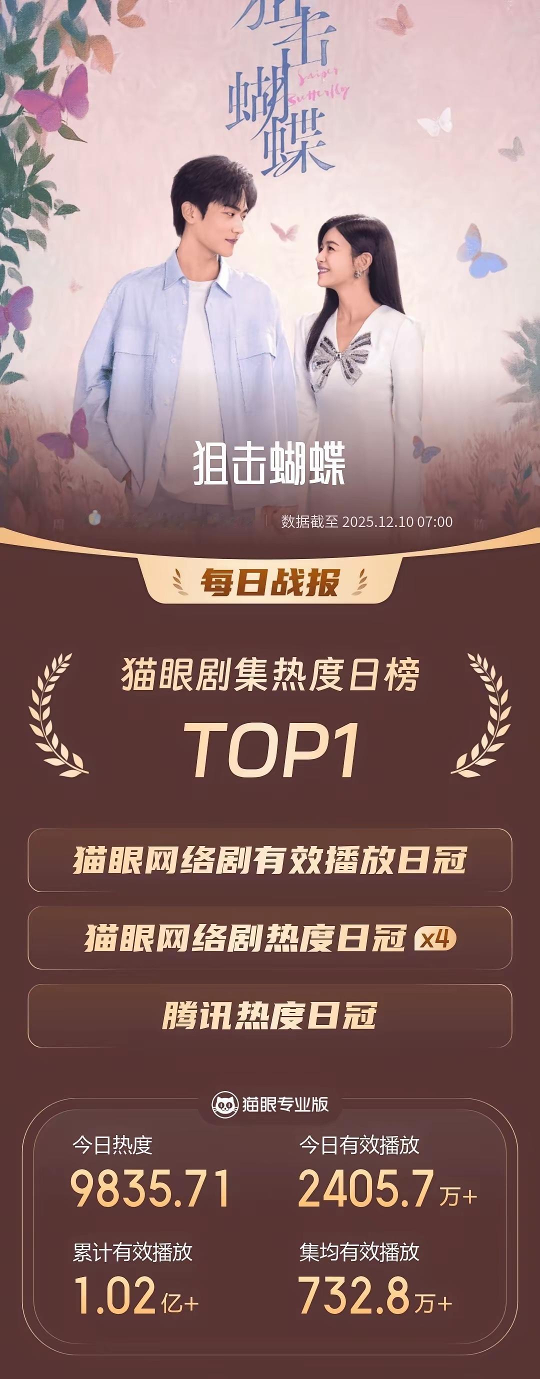 年度黑马杀疯了! 《狙击蝴蝶》逆袭封神, S+大剧集体沦为背景板 谁能想到!一部没流量加持、投资仅够S+剧零头的A级小成本现偶《狙击蝴蝶》,直接杀进腾讯2025年热度总榜第23名,稳坐平台现偶TOP3宝座,这波年末逆袭简直爽文照进现实! 没有天价投资堆砌服化道,没有顶流自带的粉丝盘,《狙击蝴蝶》全靠扎实内容赢麻了——19岁年龄差的“姐狗文学”戳中观众嗨点,双线叙事+细节伏笔闭环看得人欲罢不能,陈妍希与周柯宇的“墙吻”名场面单日抖音播放破12亿,开播4天站内热度破2.5万,豆瓣7.2分的口碑更是甩同期现偶几条街。它用实绩证明:好剧从不需要流量镀金,内容质感才是硬道理! 反观腾讯那些押宝的S+大剧,简直集体翻车沦为笑话:《枭起青壤》顶着迪丽热巴、陈星旭的阵容,拿着S+评级却高开低走,集均播放仅900万,刚完结就被《狙击蝴蝶》反超,糊得悄无声息;投资6亿的《长安的荔枝》把几万字小说硬注水成35集,粗劣特效劝退观众,集均播放还不如《狙击蝴蝶》零头;就连钟汉良、秦岚主演的《亦舞之城》,坐拥“王炸阵容”却越播越冷,被晚播一周的《狙击蝴蝶》轻松赶超热度。这些拿着顶级资源的大制作,要么靠魔改剧情消耗原著粉,要么靠流量堆砌掩盖内核空洞,最后连部小成本剧都打不过,属实丢尽了S+的脸面! 《狙击蝴蝶》的逆袭,不仅是黑马的胜利,更是给内娱浮躁的影视圈一记耳光:与其砸钱请流量、搞虚头巴脑的营销,不如沉下心打磨剧本和演技。这匹年末黑马,凭实力让所有“流量至上”的烂剧都黯然失色!狙击蝴蝶 狙击蝴蝶大结局