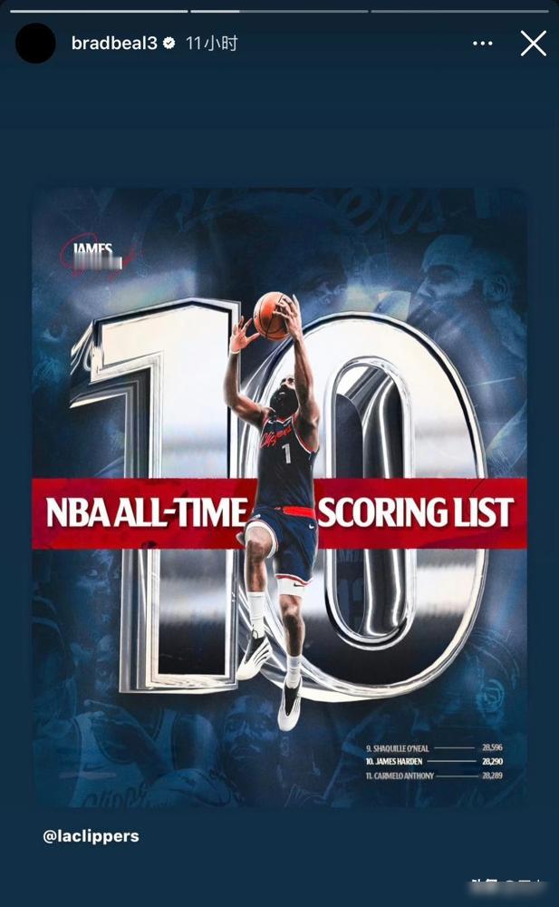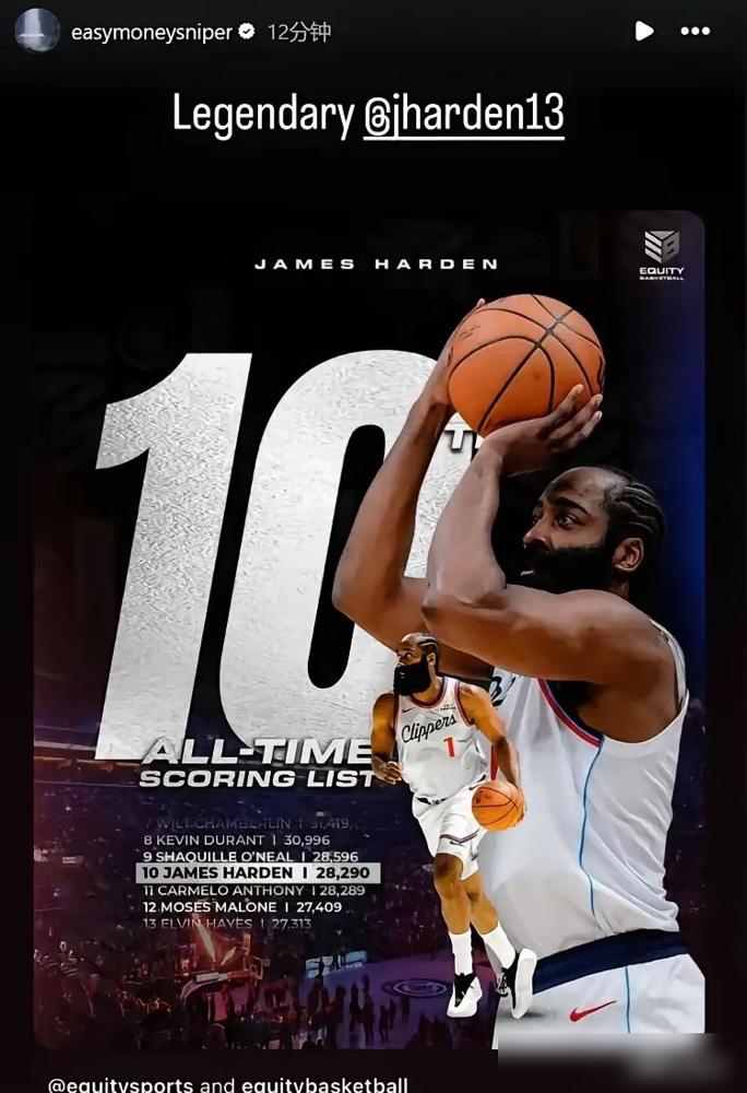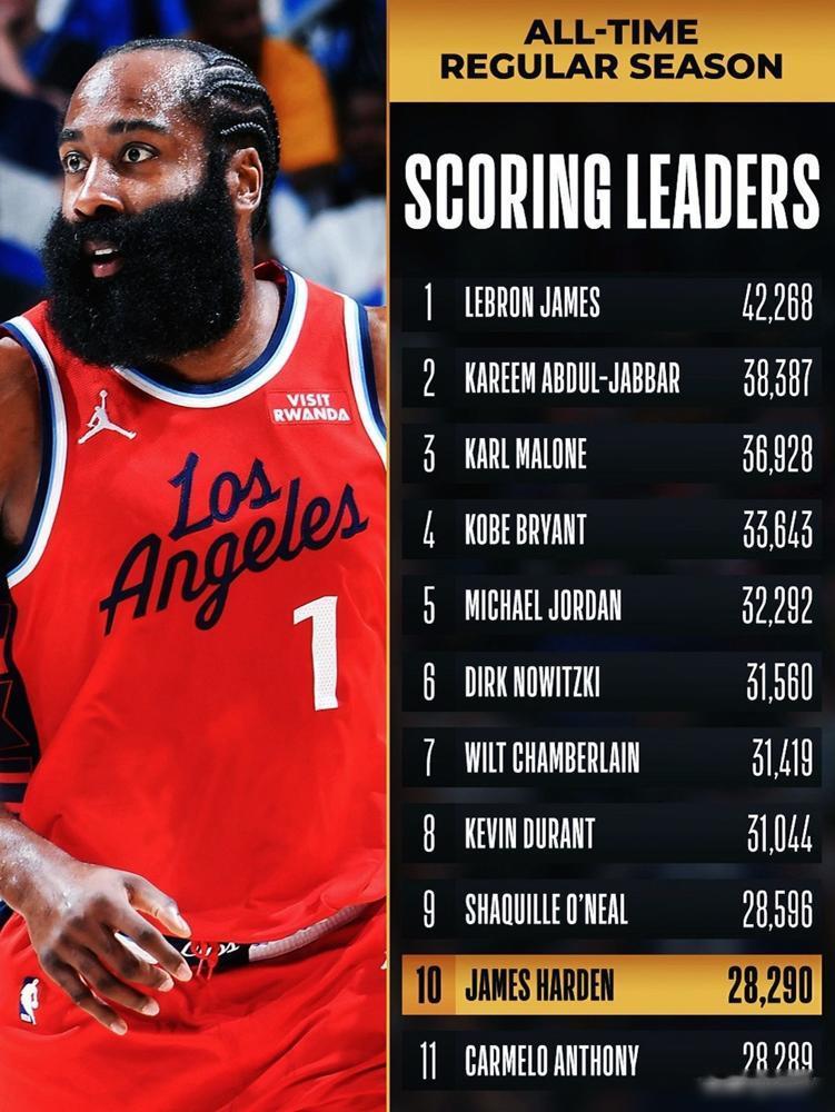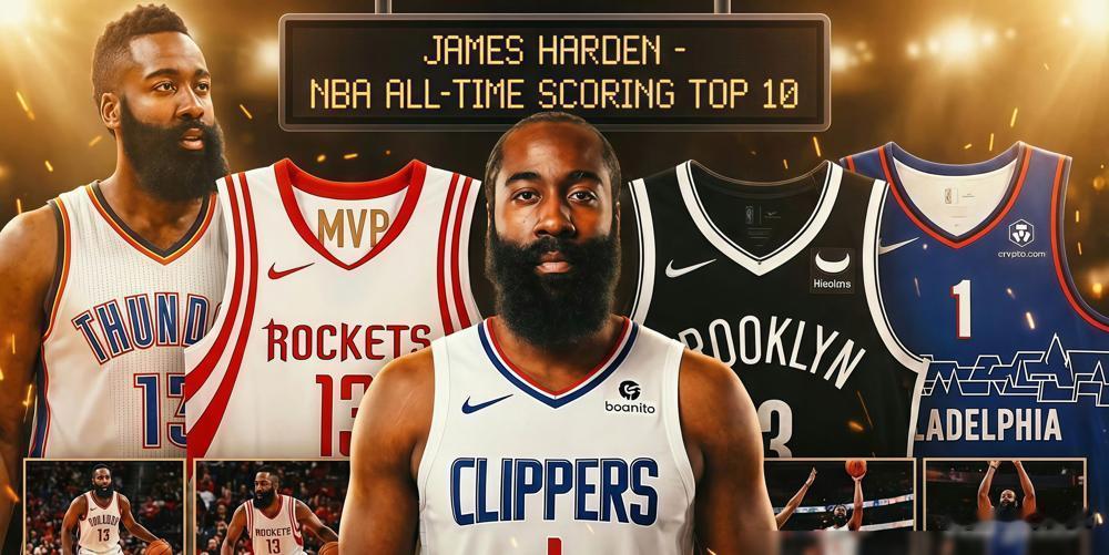 其次,前十得分手中,只有三位是后卫出身,哈登荣幸和乔丹、科比并列,现役就登哥一人,实属难得! 现役独一份,这份荣耀,沉甸甸的。 这家伙的篮球路,压根就不是什么天选之子的剧本。 贫民窟的出身,哮喘病的困扰,每一项都像是要把他按在原地。 可他偏不,用一次次后撤步,一步步后撤,撤出了属于自己的广阔天地。 当别的天才靠着飞天遁地碾压对手时,哈登选择用最纯粹的脑子打球,他把地板流技术打磨到了极致,一种看似笨拙却无比聪明的生存哲学。 看看那份榜单吧,勒布朗、贾巴尔、马龙……哪个不是身高臂长、天赋异禀的怪物? 哈登自己都坦言惊讶,“他们都比我高大得多,也比我更有运动天赋。 ”这份清醒的谦逊,比任何豪言壮语都更有力量。 他是在用另一种方式重新定义“天赋”,篮球智商、节奏掌控、创造空间的能力,这些同样是顶级的天赋。 他的成功,给无数身体条件并不出众的孩子点亮了一盏灯,篮球,不全是关于你能跳多高。 说到后撤步三分,这已经不再是他的个人标签,而是整个篮球时代的印记。 全球的野球场,你都能看到孩子们模仿着他的动作。 三十六岁的年纪,他反而打出了生涯代表作,快船对阵森林狼一役,他轰下34分5篮板6助攻的全面数据,用实际表现告诉世界,巅峰从未远离。 NBA官方都不得不承认,哈登是那个顺应潮流并亲手塑造潮流的人。 站在历史得分榜前十的门槛上,哈登的旅程远未结束。 他的每一次得分,都在为后来者拓宽想象的边界。 这个从底层挣扎上来的巨星,用他的故事诠释了何为真正的逆袭。 他的传奇,仍在继续书写。