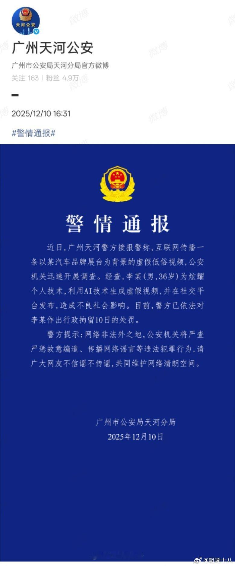之前那个用AI技术生成低俗虚假视频抹黑小鹏汽车的人,被警方处以行政拘留10天。