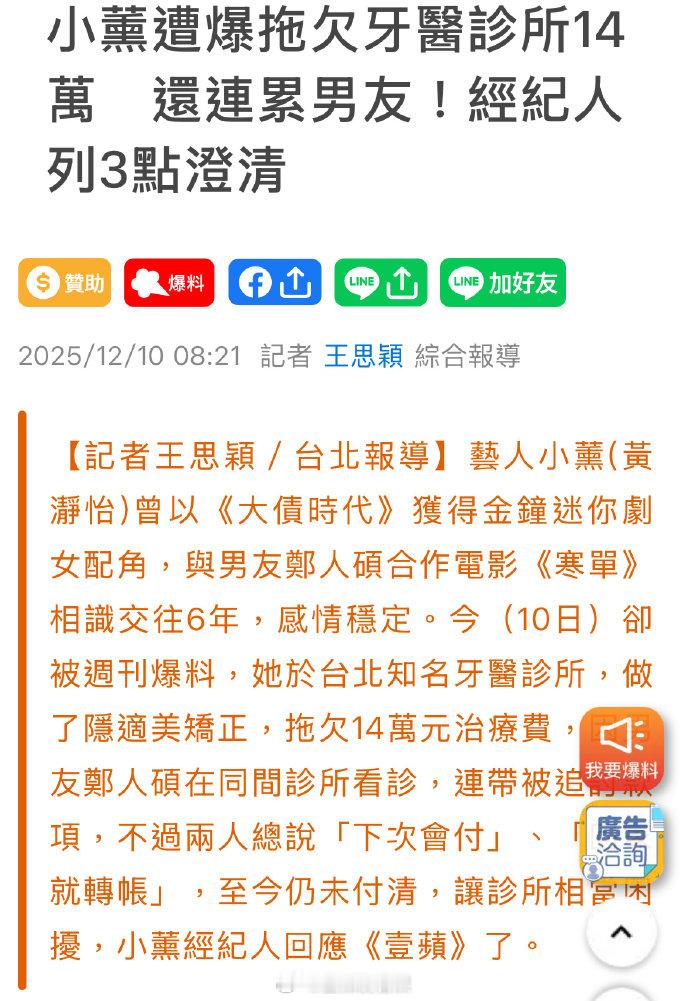 经纪人回应小熏拖欠牙齿矫正费用 台媒曝小薰牙齿矫正费用纠纷,诊所称其多次承诺付款却未兑现。经纪人正式回应:“相关款项均已结清”,称属私事不便占用公共资源,感谢理解。