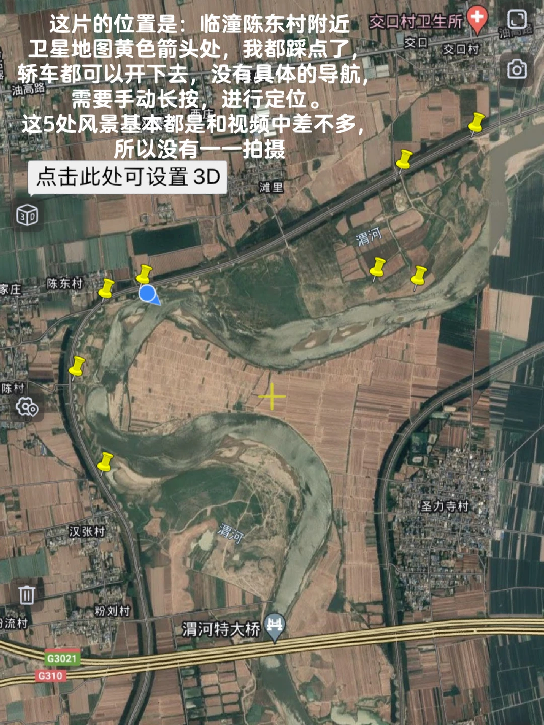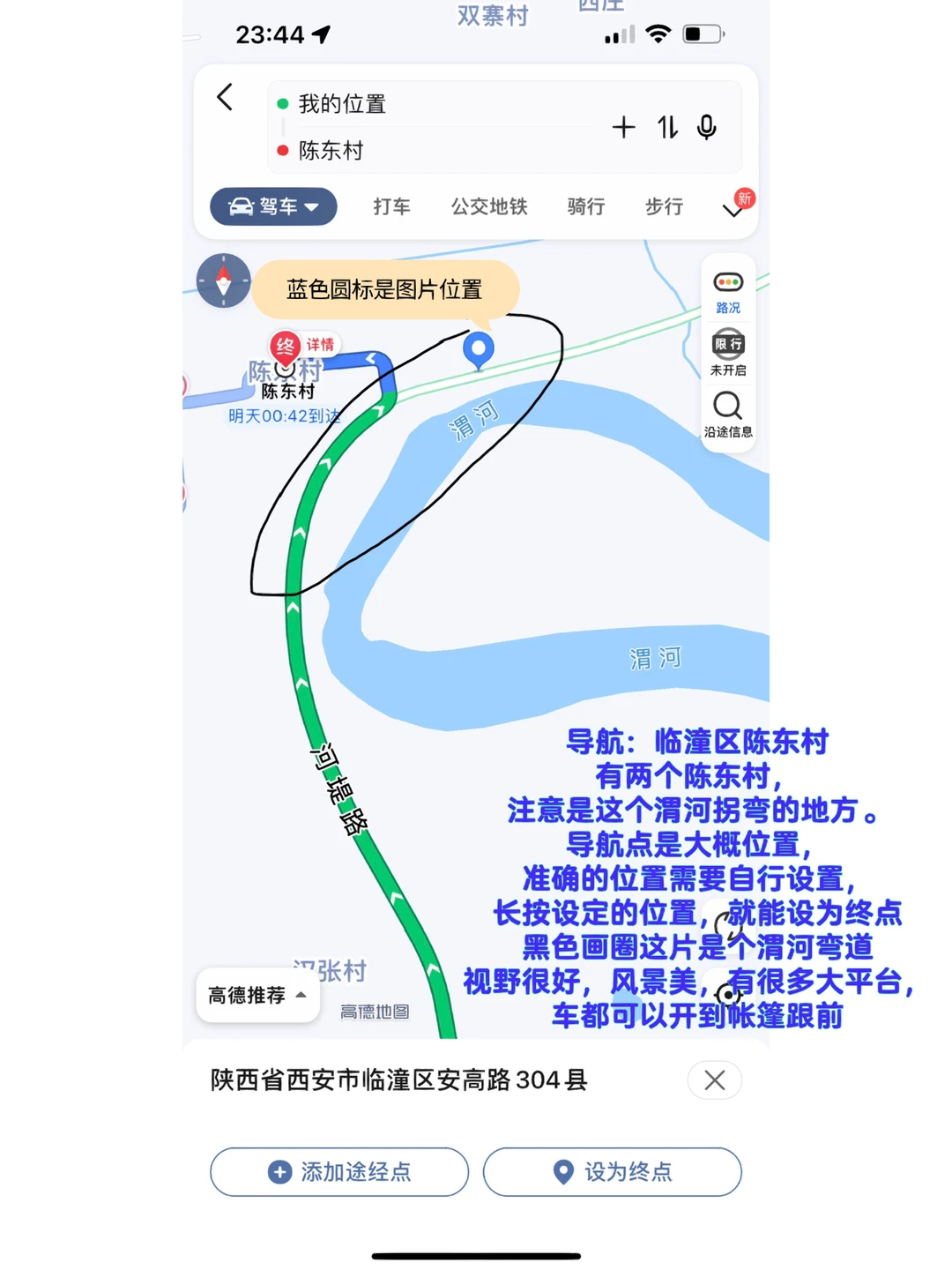 [打卡R][打卡R]可以导航:临潼区陈东村,有两个,要选那个在渭河弯道边这个,最后导航截图了。但不要直接导航,导航点只是个大概位置,按照最后图的点位,手动长按位置自行设置成终点,进行导航。这样最准确哈。[打卡R][打卡R]这里有时候风大卡式炉要带挡风板。今天重度雾霾天,如果大晴天,拍照很美。