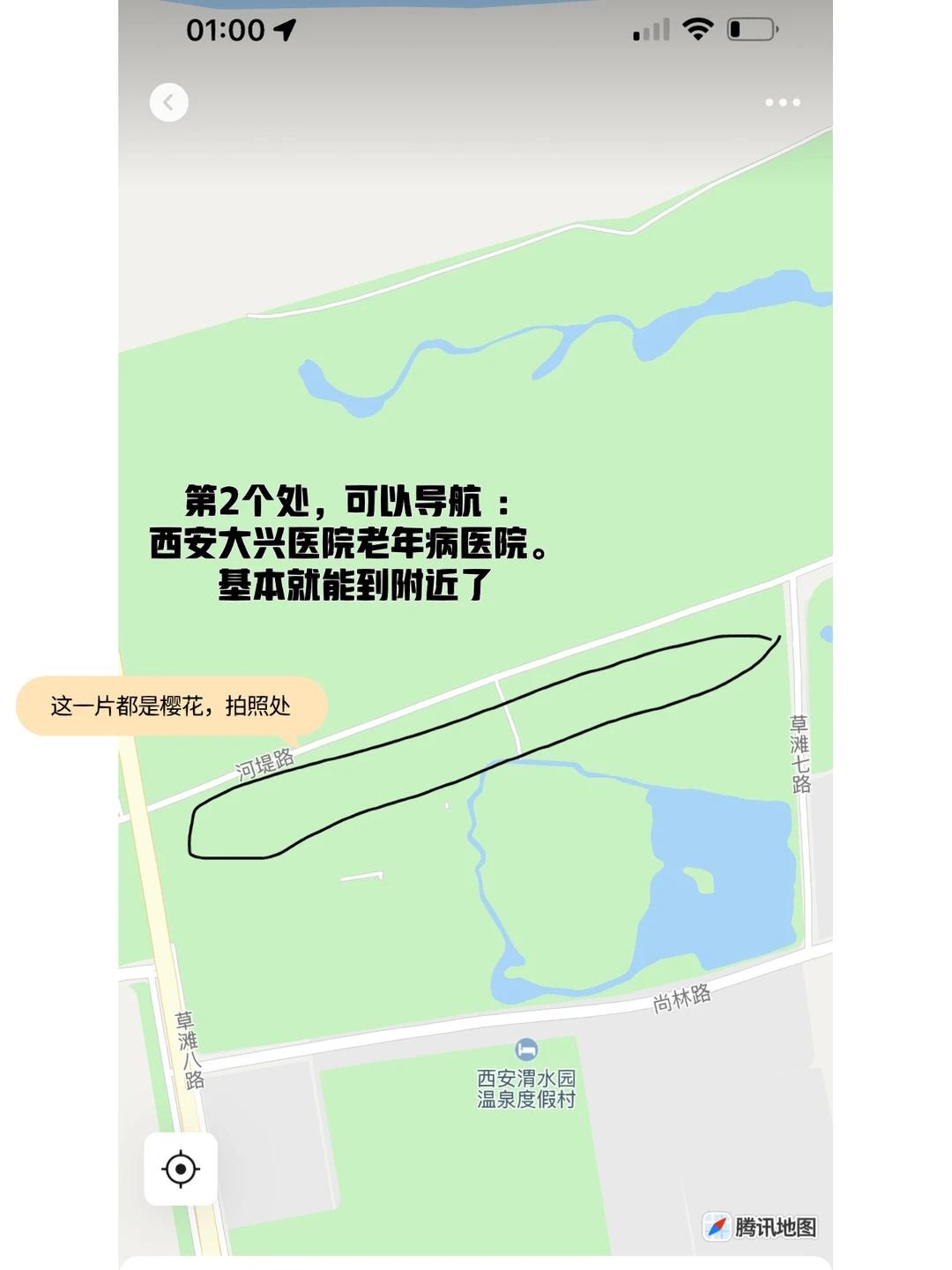 [拔草R][拔草R]第二个地方河堤路草滩七路到草滩八路,很大一片全是樱花树,特别美,真的后悔没早去!这里花的树枝错落有致,很多枝叶往下长,不用梯子,随便就可以拍出来那种满屏都是花的感觉。近期一周内还有快去,如果你错过了,那明年不要错过哦!搭配绿草地拍照太美了。有空地也能搭帐篷,真的就是搭在花丛中的感觉!