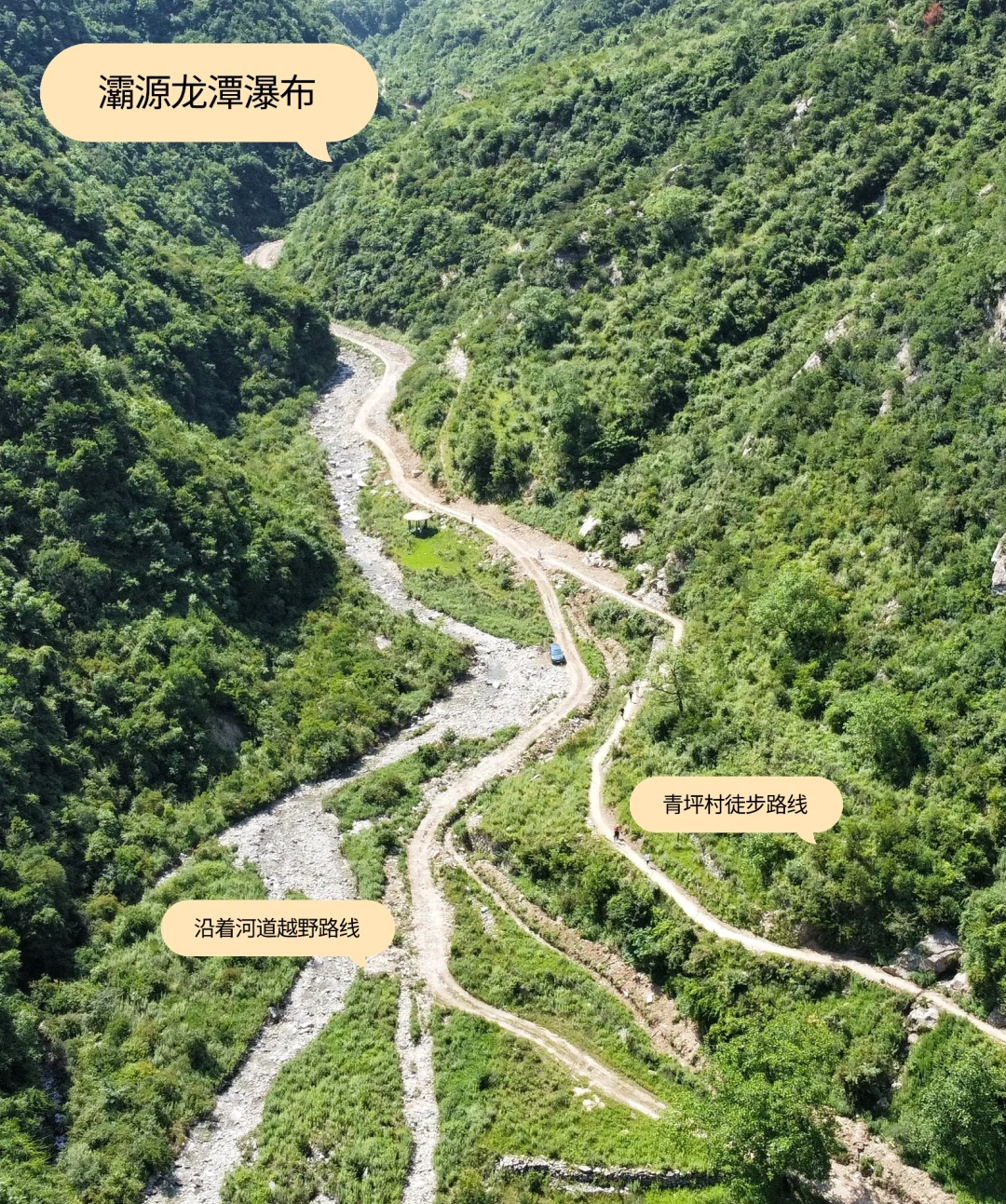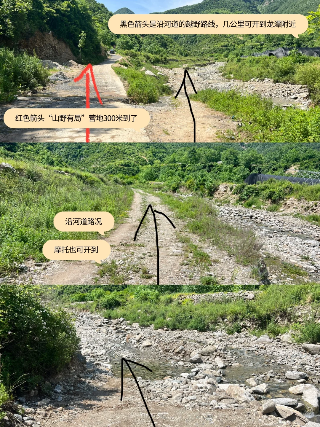 ✅✅龙潭瀑布地址:快到“山野有局营地”大概300米处,有一条拐下河道的路,具体看最后图。然后沿河道一直开2.3公里左右可到龙潭。
