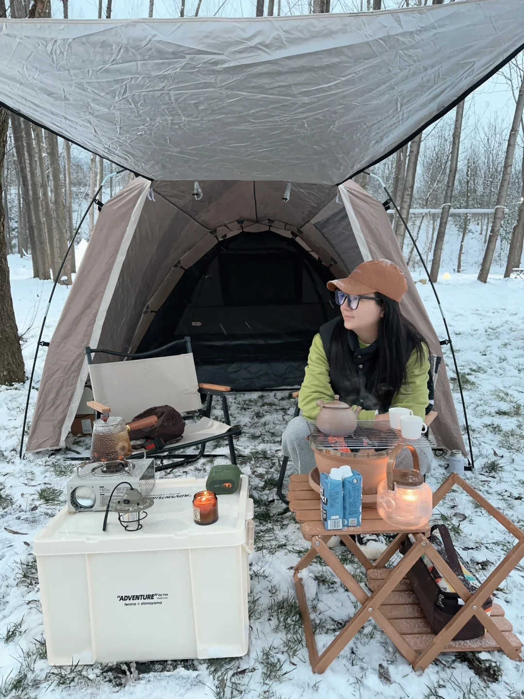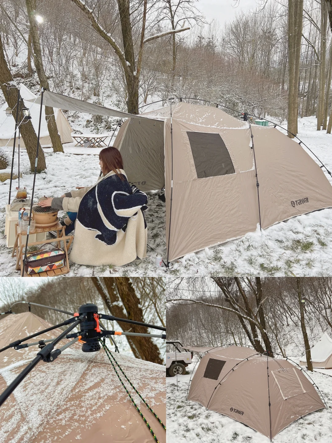 [拔草R][拔草R]今天顺便开了我的新帐篷 tawa帐篷 t3一室两厅家庭帐。搭建方便,后面绳子一拉,两秒打开,5分钟就可以安装完成。对于女生很友好,流沙金极的简设计,颜值很高。零下3度,大雪也抗的住。遮阳门厅下适合安置户外装备,与家人朋友来杯舒适的下午茶。