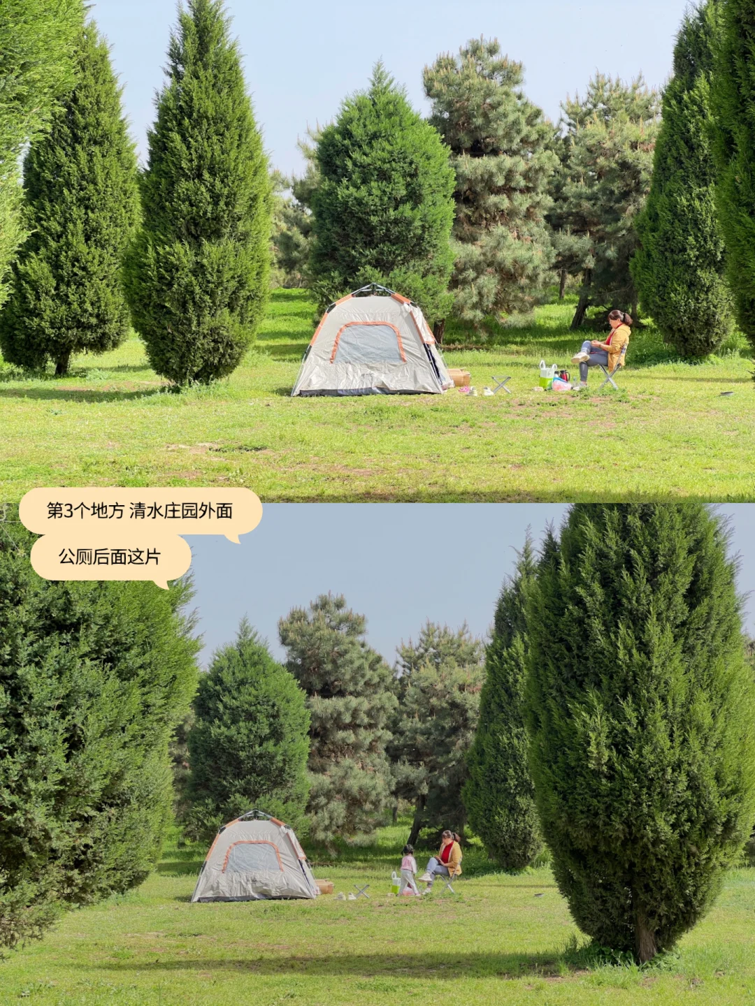 [三R]导航“清水庄园”,在快到导航点几百米,从河堤路拐下坡的地方,有个公厕,附近也有个停车场。公厕后面是一片草坪和松柏树。停车场后面也是一片草坪树林。可烧烤过夜,有卫生间。