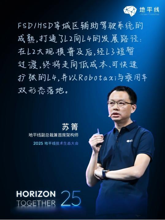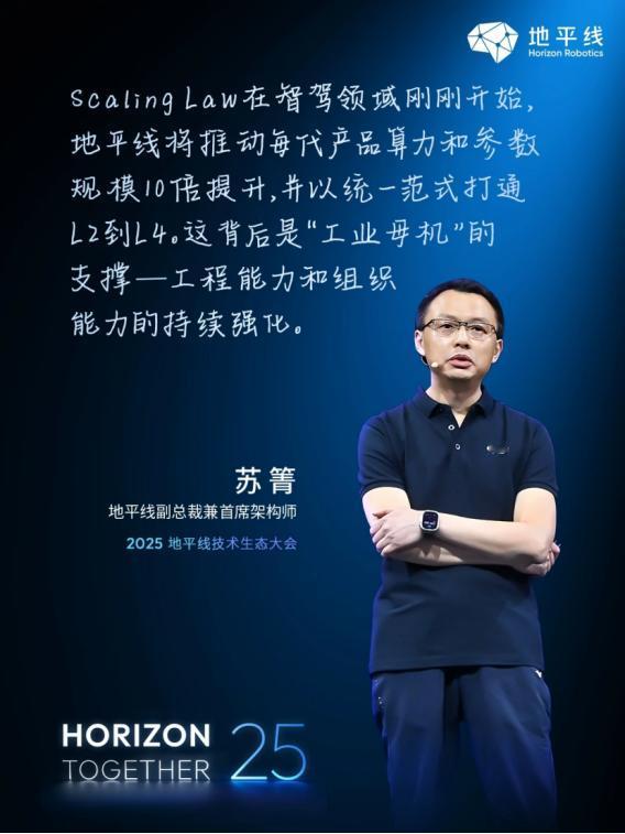 从内核重构到高阶普惠:智能驾驶的征途与远方 智能驾驶的征途,始于每位开发者智力与体力的双重跋涉。 2024年,行业完成从规则驱动跃向数据驱动的“内核重构”,意义堪比核能从理论迈向工程。一条从L2到L4落地普及的路径就此打通。 未来,地平线将不断推动每代产品算力和参数规模10倍提升,持续强化工程能力与组织能力,让智能驾驶以可触达的价格,无感抵达用户。 这不仅是我们过去辛苦投入的意义,也是我们共同奔赴的远方2025地平线技术生态大会 技术向高造就生态同行 人人都是中国智驾合伙人