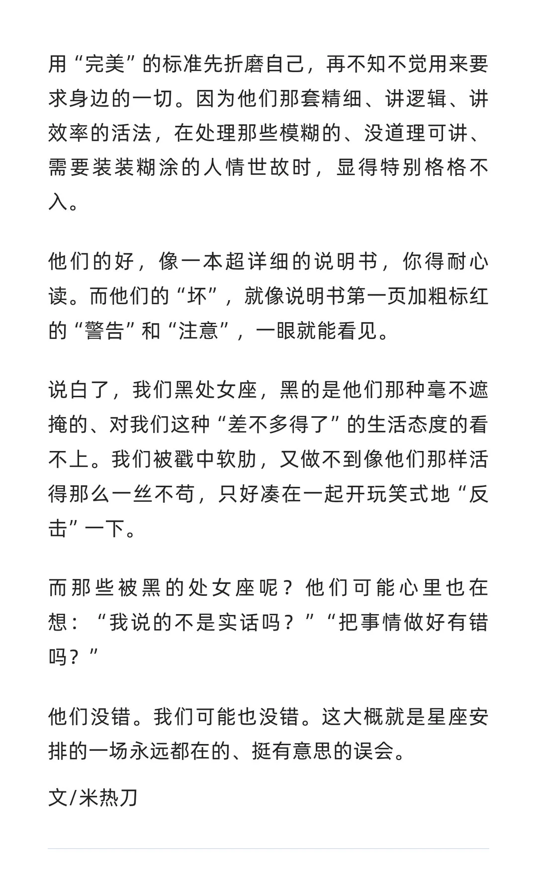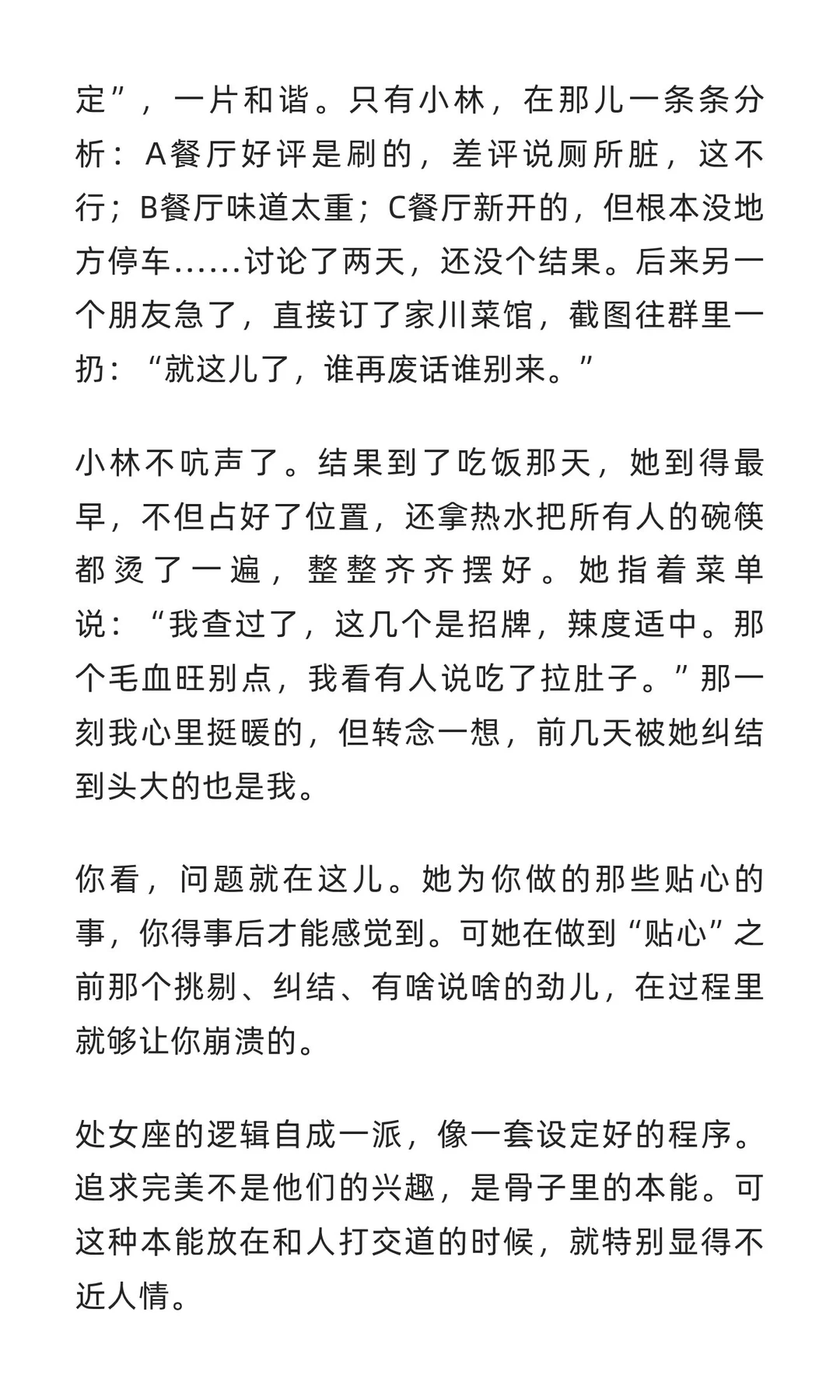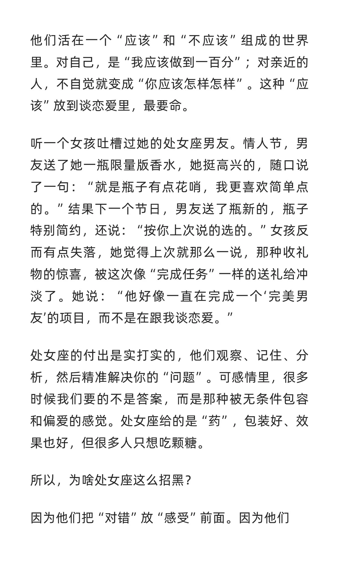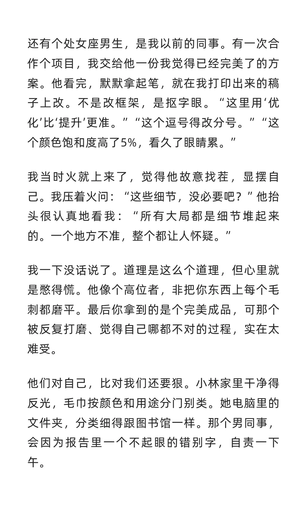 处女座追求完美,挑剔纠结的过程常常让人崩溃。而他们细致入微的“好”需要时间慢慢体会。处女座的逻辑自成一派,追求完美不是他们的兴趣,是骨子里的本能。