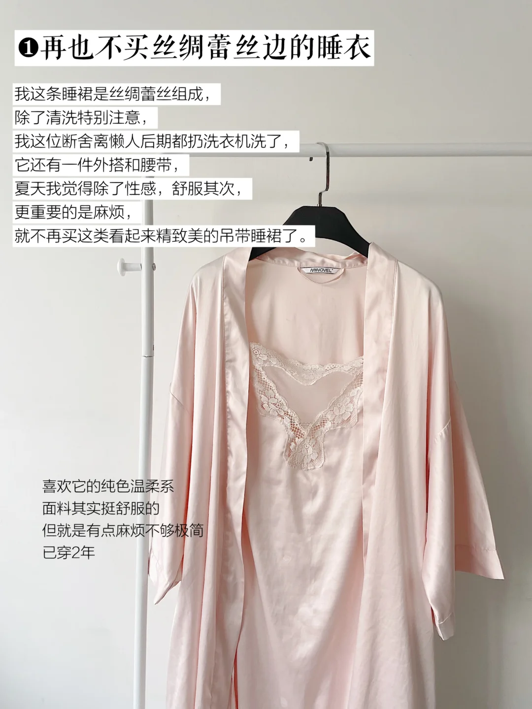 我有过一条睡裙是丝绸蕾丝组成,除了清洗特别注意,我这位断舍离懒人后期都扔洗衣机洗了,它还有一件外搭和腰带,夏天我觉得除了性感,舒服其次,更重要的是麻烦,就不再买这类看起来精致美的吊带睡裙了。