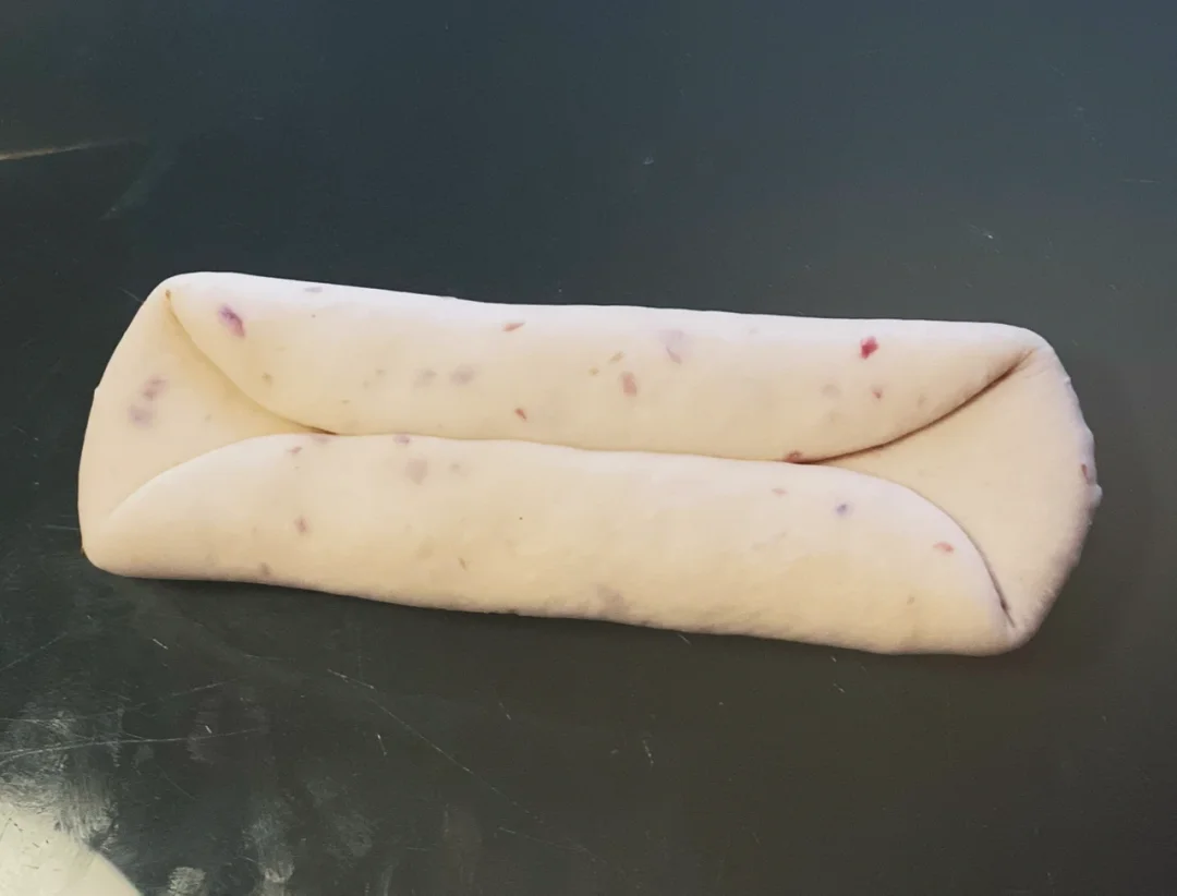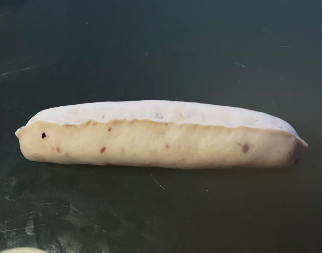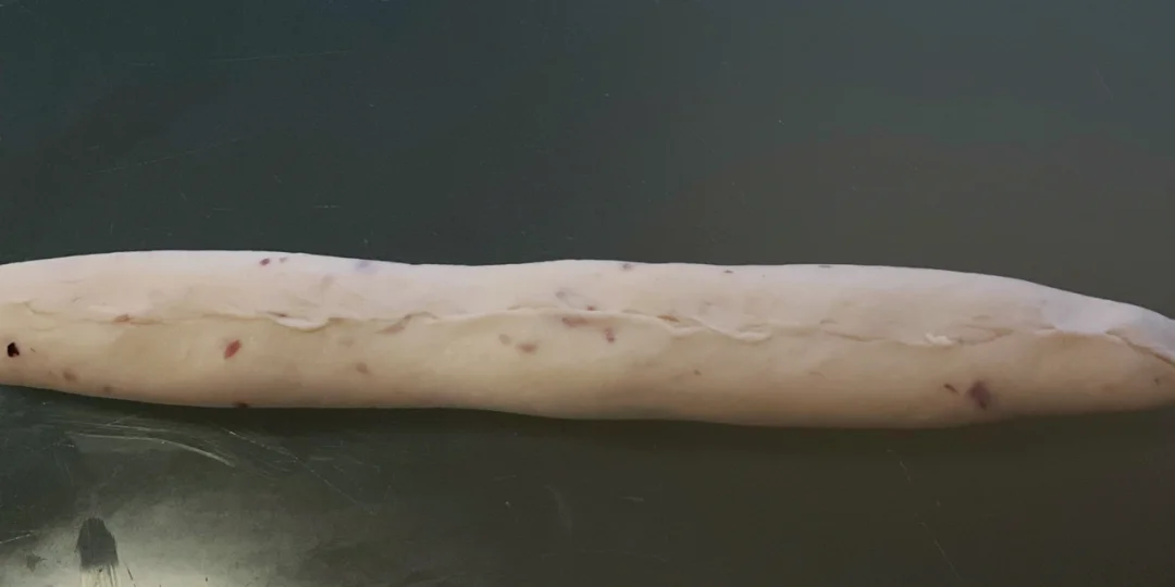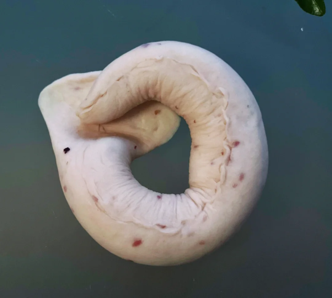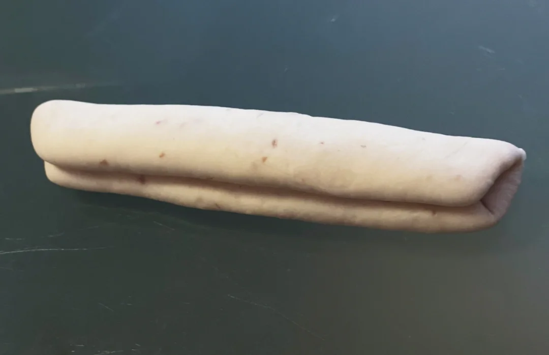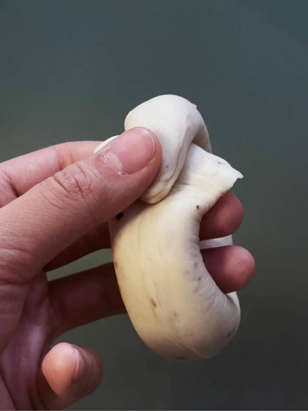 略微收瘦至橄榄形,擀开。 上下分别向内对折,压平,不要留气泡。 再次向内对折,压实,捏紧收口! 擀长,至大约22cm。喜欢胖的就短点,纤细就长点 一边底部打薄,一边搓细 绕圈头尾相接,保证捏口朝向一个方向。 捏死~否则煮的时候会爆开~