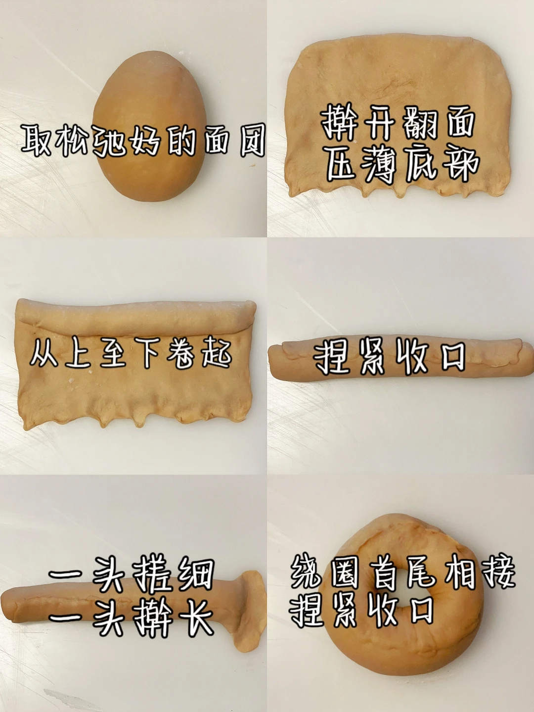 📎面团光滑即可但也需要一定筋度,手揉也很快~烘烤过程中底部炸开则是制作时未捏紧收口,侧面撕裂状则是卷太紧松弛不够/筋度太弱