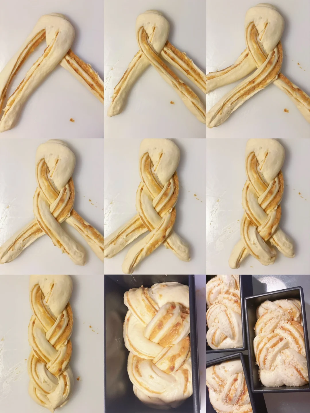 6⃣️将卷略微擀扁,拿刀切成三条头不切断,编辫子至末端捏紧,首尾向下折放入吐司盒。