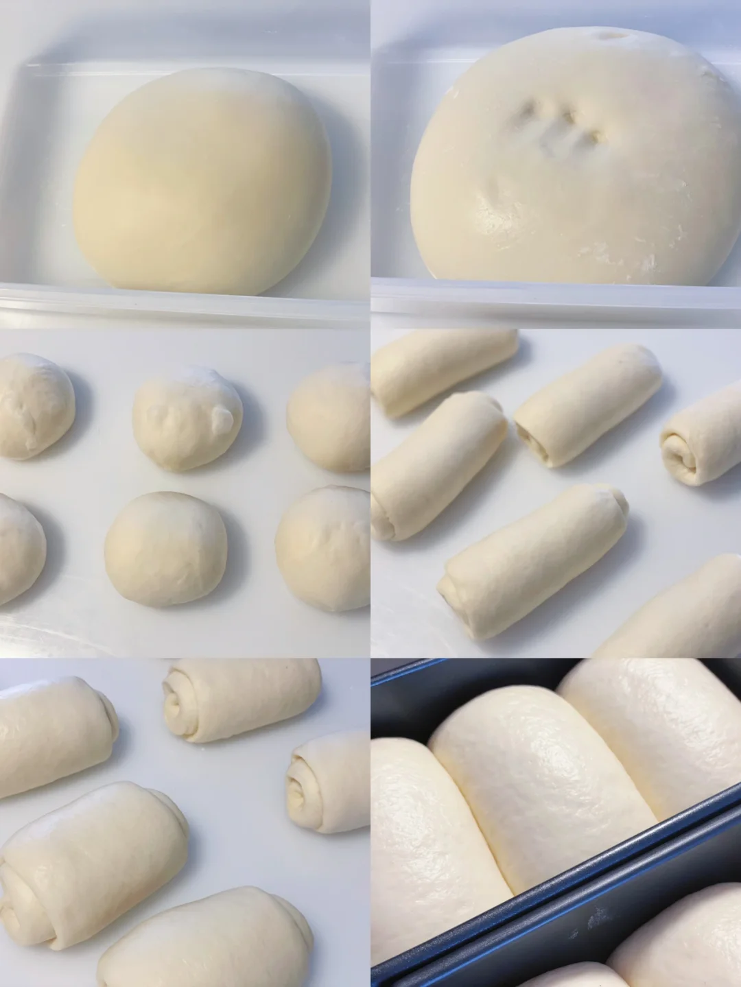 5⃣️一次擀卷,继续松弛20分钟;二次擀卷,3个一组入模,35度/80湿度发酵至9分满
