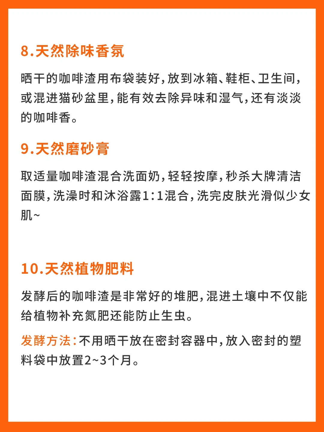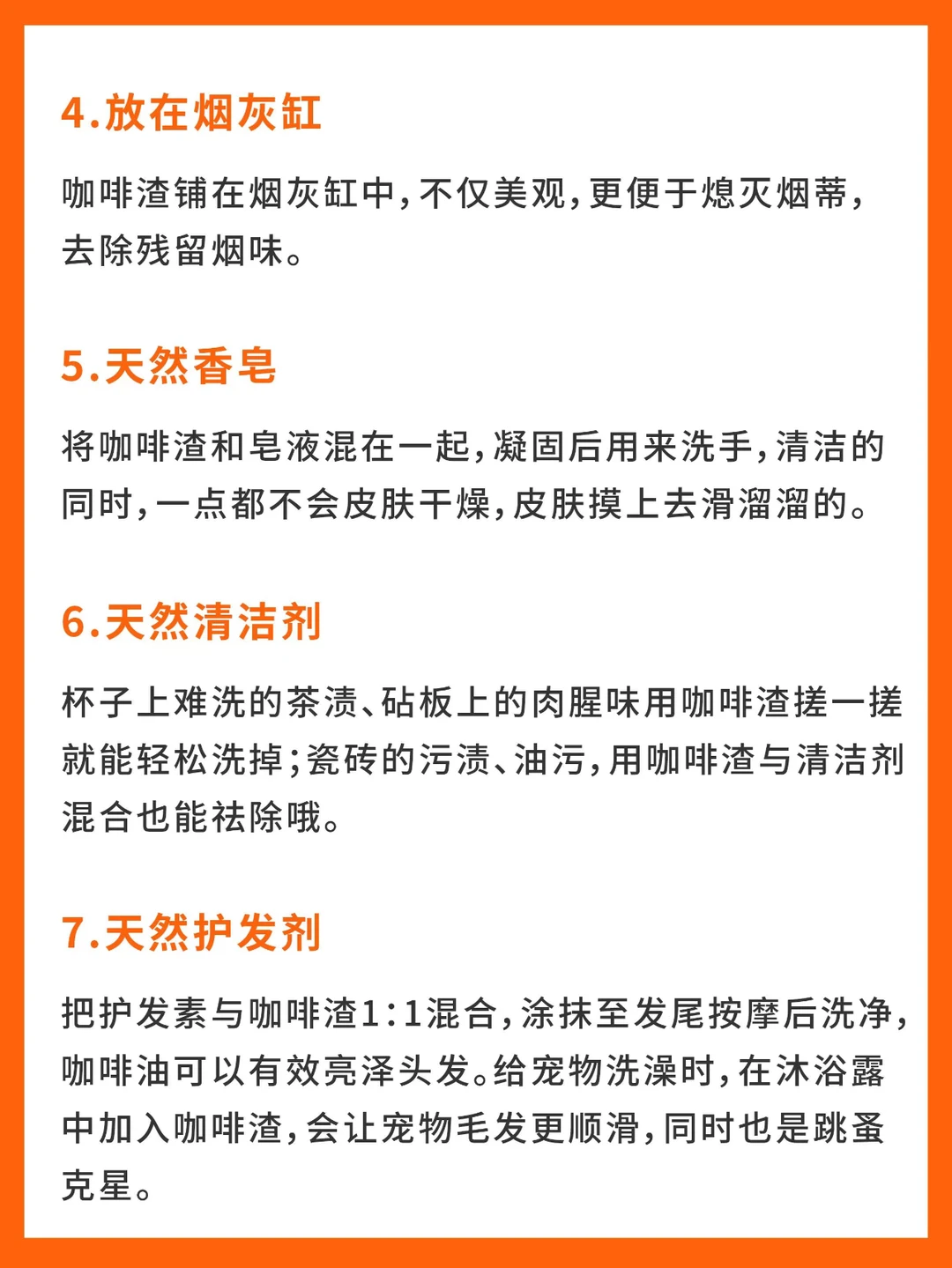 取适量咖啡渣混合洗面奶,轻轻按摩,秒杀大牌清洁面膜,洗澡时和沐浴露1:1混合,洗完皮肤光滑似少女肌~