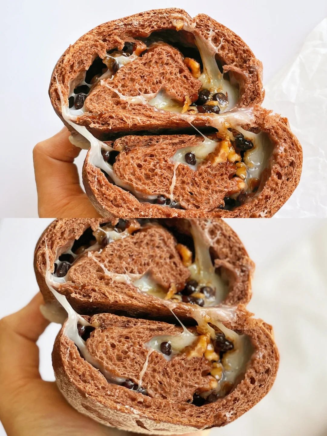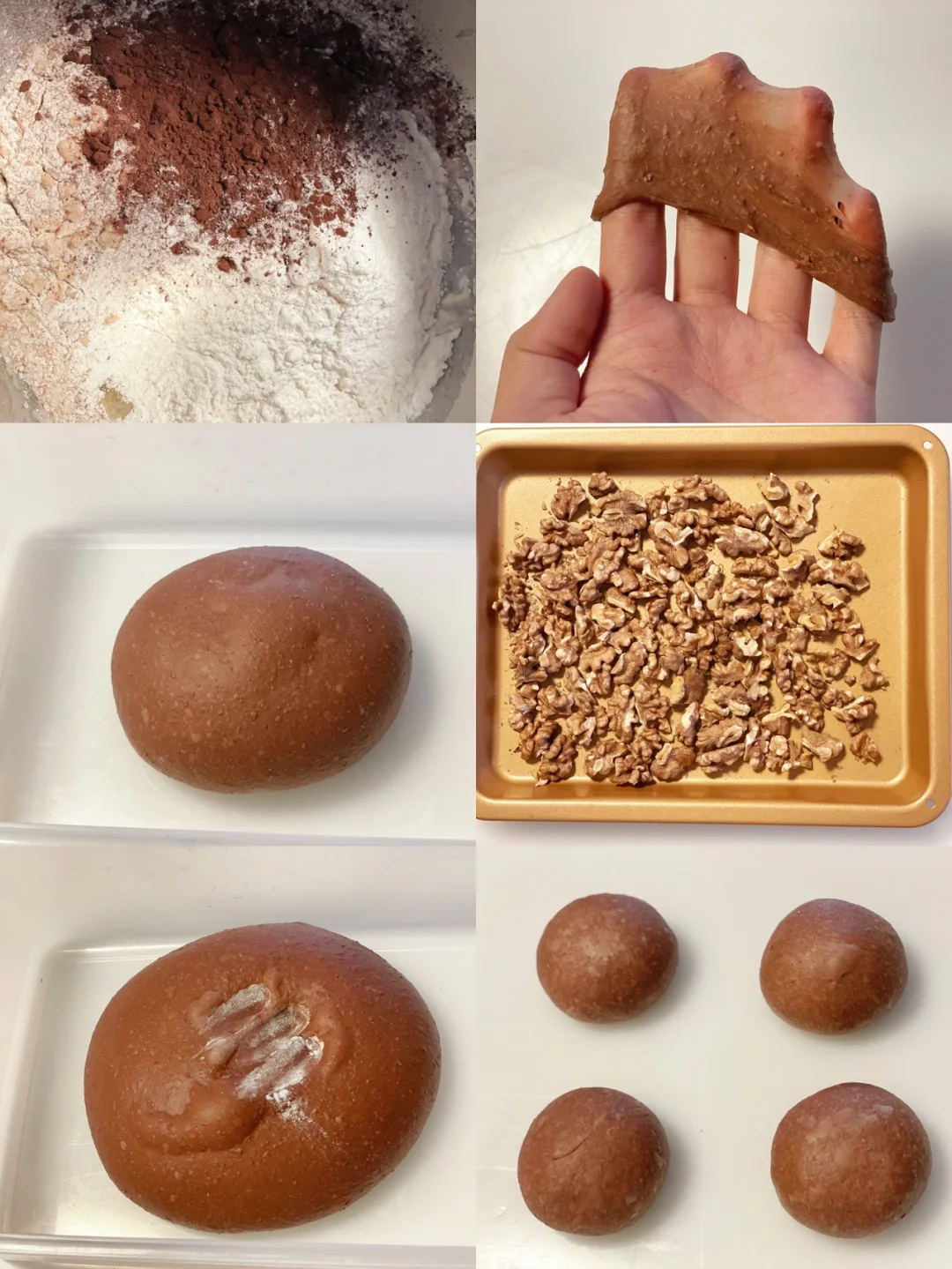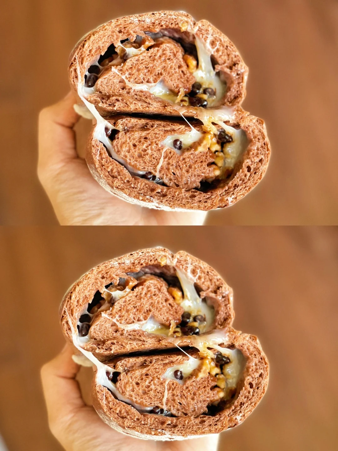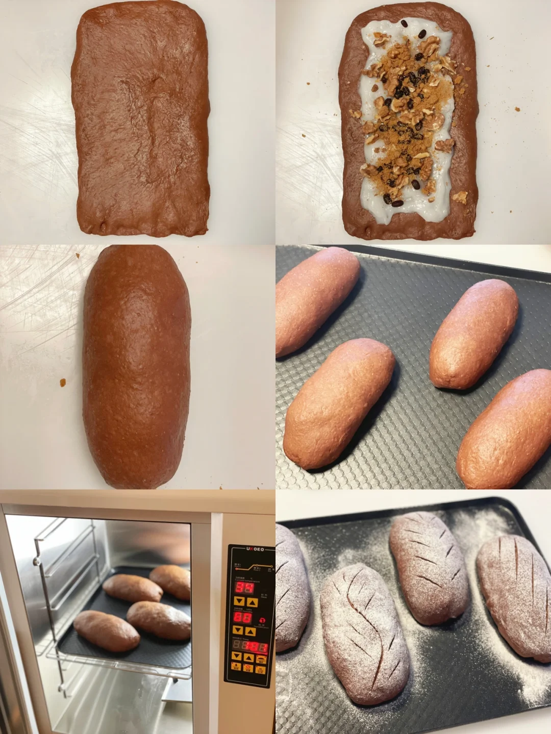 🥣面团:高筋面粉200g|全麦粉50g|可可粉15g|盐3g|红糖30g|全蛋液50g|鲜酵母9g|牛奶145g|老面60g|黄油20g