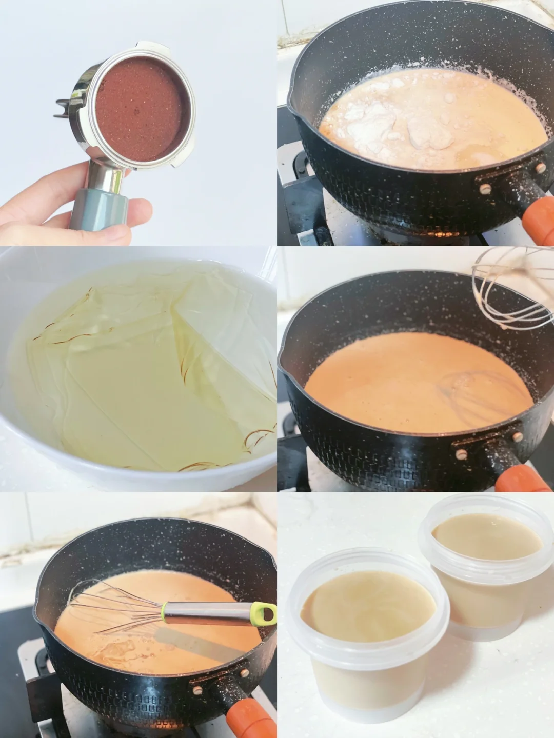 2⃣️将浓缩咖啡液/牛奶/椰浆/椰子粉/糖倒入锅中,搅拌加热至微微冒小泡