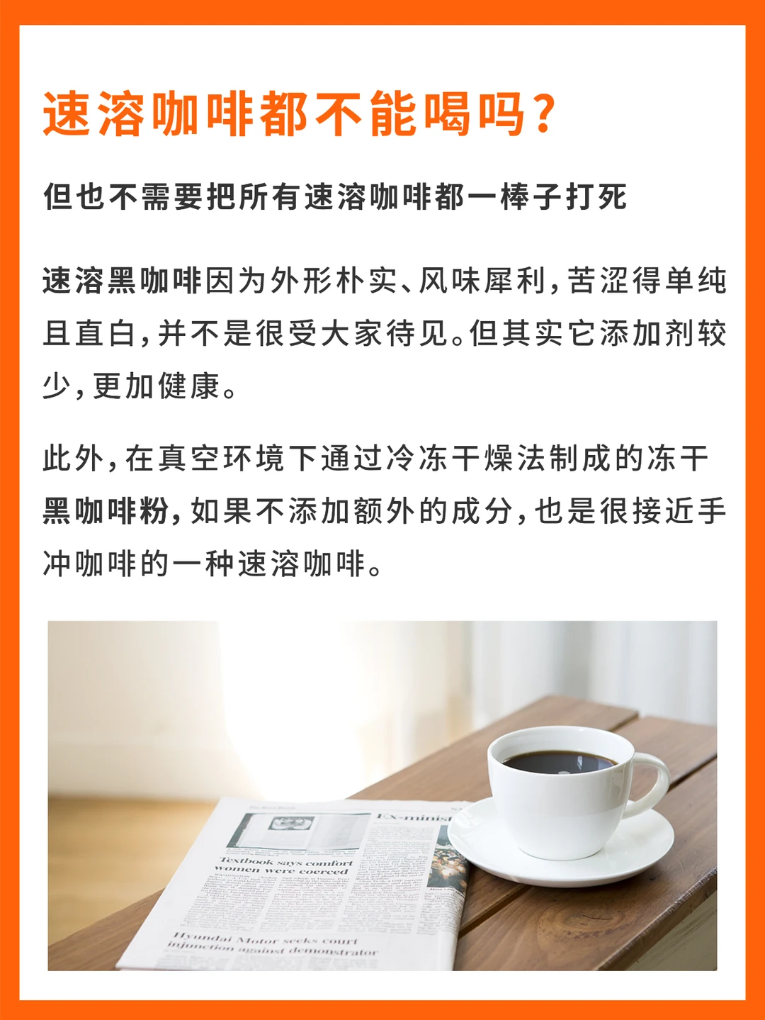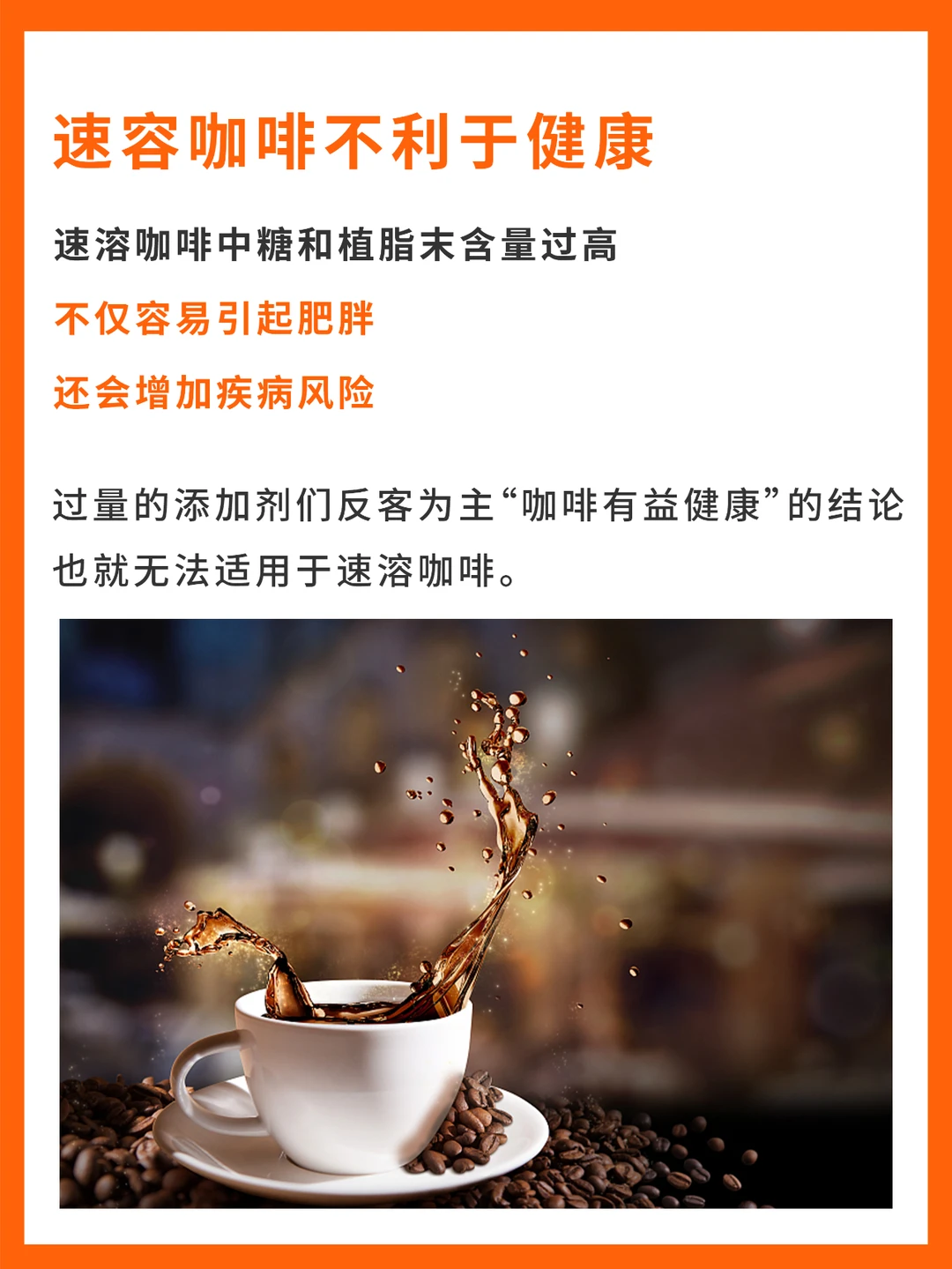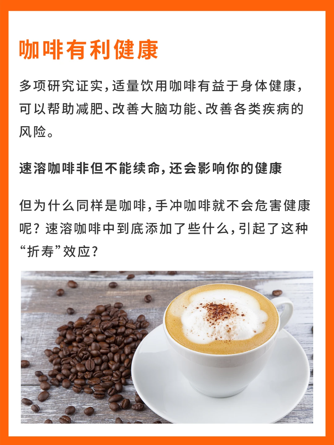 ☕ 咖啡续命,但速溶咖啡不行 ☕ 多项研究证实,适量饮用咖啡有益于身体健康,可以帮助减肥、改善大脑功能、改善各类疾病的风险。 ☕ 速溶咖啡非但不能续命,还会影响你的健康。 但为什么同样是咖啡,手冲咖啡就不会危害健康呢?