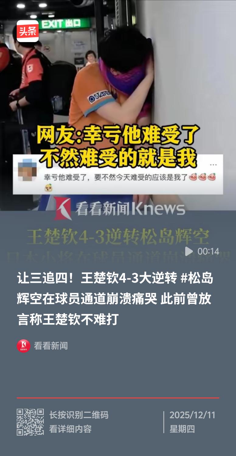 WTT香港总决赛男单1/8决赛,王楚钦和松岛辉空这场比赛太精彩了。王楚钦在大比分0 - 2、1 - 3落后的绝境下,完成4 - 3的惊天逆转。松岛辉空手握巨大领先优势却被反超,心态直接崩了。赛后他气愤地把毛巾抛向天空,进入球员通道后,靠着墙捂着脸痛哭,大肚腩都隐约可见。 松岛辉空才18岁,未来还有提升空间。韩媒觉得他会成日乒领军人物,还有机会击败王楚钦。场边张本智和一脸坏笑,看来是怕地位不保。这场比赛王楚钦太牛了,逆转经典战役实锤!