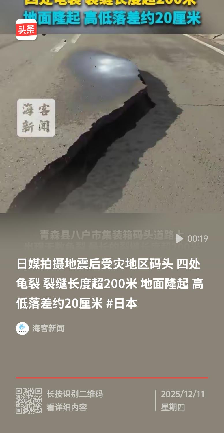 日本这地震真够狠的!12月10日,青森县东部海域地震让当地码头遭了大殃。就说八户市的集装箱码头吧,那场面简直惨不忍睹。道路上全是龟裂,最长的裂缝超200米,跟一条条狰狞的伤疤似的。 而且地面大幅隆起,有些地方高低落差能达到约20厘米,放集装箱的地面都扭曲变形了。好好的码头,这下约三分之一的区域都用不了。自然灾害面前,人类的力量还是太渺小,也不知道这码头得多久才能恢复正常使用。 日本大地震