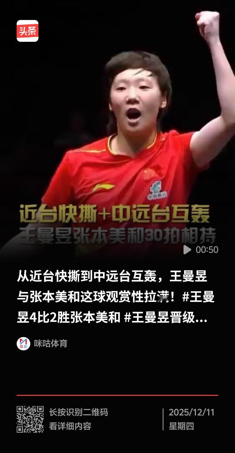 2025年12月10日晚WTT香港总决赛女单1/8决赛,王曼昱4 - 2击败张本美和晋级八强,这已经是王曼昱第九次击败她,“曼昱魔咒”名不虚传。 比赛超刺激,一开场双方就火力全开。第三局是焦点,王曼昱8 - 3领先时,出现一记30拍超长对攻,双方反手对反手打得难解难分。张本美和随后改变策略开长球,连追5分扳平。王曼昱请求暂停,回来后9 - 9平,张本美和13 - 11逆转。不过王曼昱实力过硬,最终还是拿下比赛。她就像经验丰富的猎人,面对张本美和的凶悍,始终能稳住阵脚,赢得实至名归! 王曼昱 王曼昱挑战赛