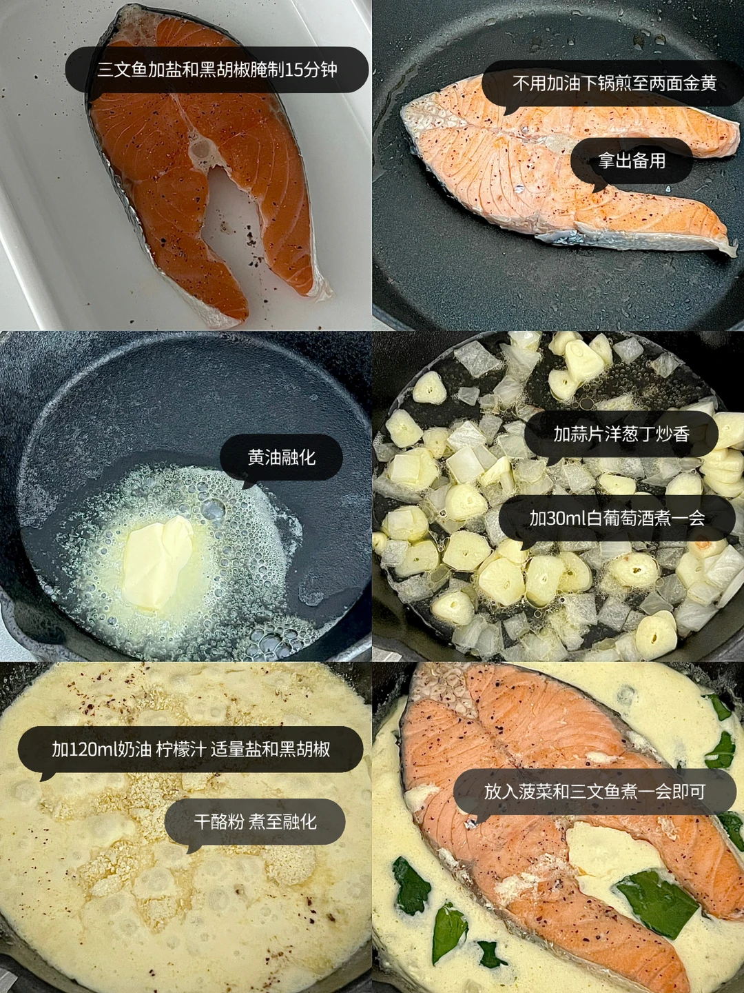 ❶三文鱼加盐和黑胡椒腌制15分钟,不用放油下锅煎,煎至两面金黄拿出备用