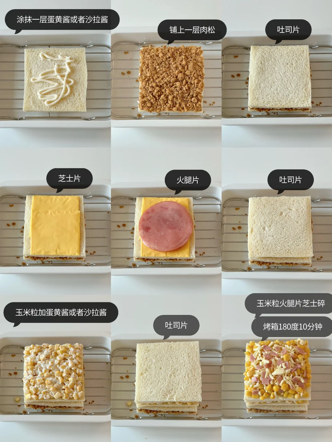 吐司🍞的神仙吃法 以前每次去面包店都会买 今天在家自己动手做 做法简单 料也足 浓郁的芝士搭配玉米和肉松 一口下去真的敲满足! · 🧾食材: 吐司🍞4片、芝士片、熟玉米粒🌽、蛋黄酱、火腿片、肉松、马苏里拉芝士碎 👩🏻🍳做法: ❶吐司去边,取一片涂抹蛋黄酱或者沙拉酱 ❷ 铺上一层肉松之后盖一片吐司 ❸ 铺上芝士片和火腿片之后再盖一片吐司 ❹玉米粒蛋黄酱或者沙拉酱,均匀铺在吐司上,再盖一层吐司片 ❺铺上一层玉米粒、火腿片、芝士碎 ❻烤箱180度10分钟