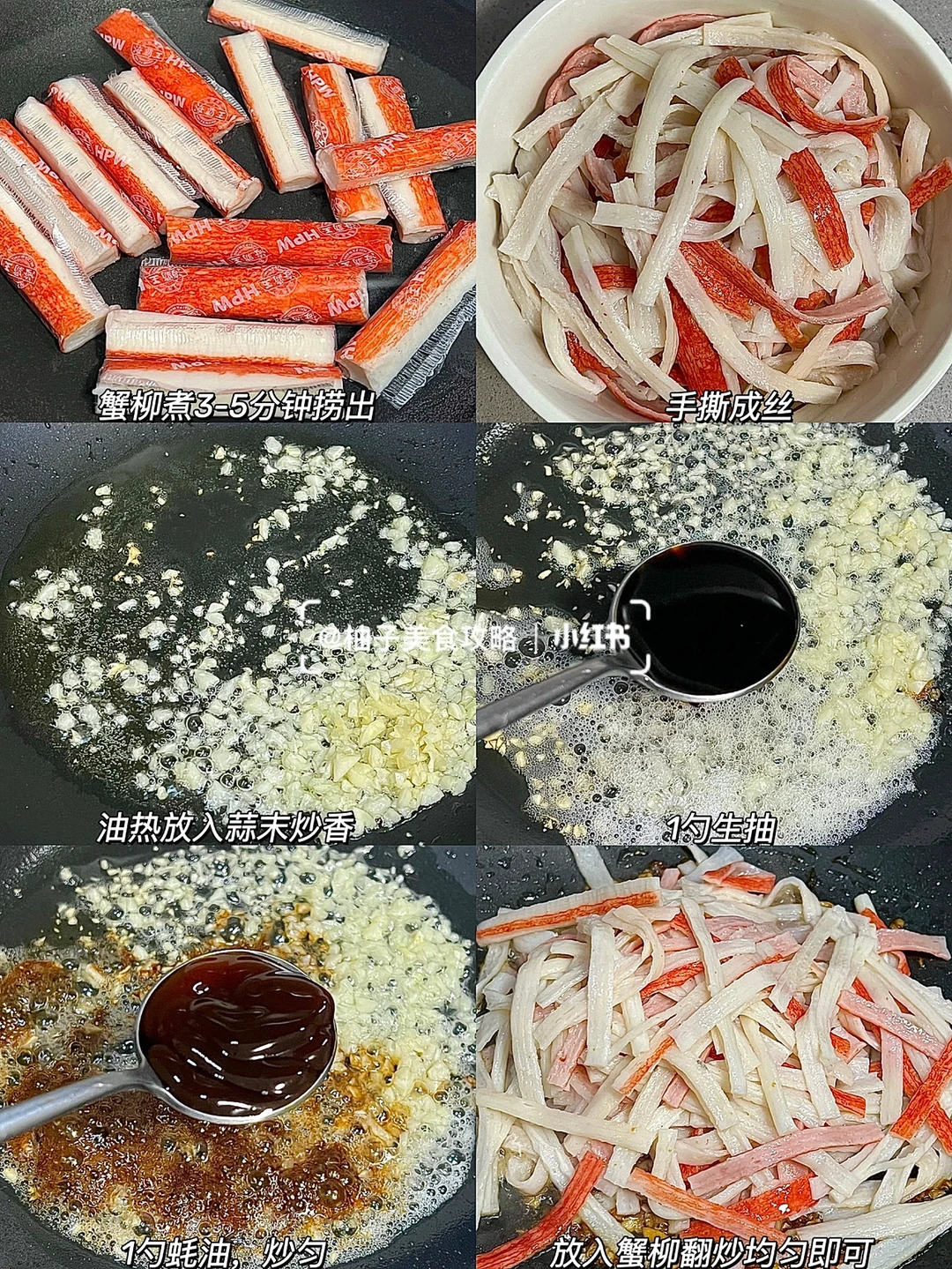 · 解锁蟹柳新吃法🔥 做法简单味道却不简单~ 谁吃谁知道,一定要试试! — 🔖蒜香蟹柳 ❶蟹柳煮3-5分钟捞出,手撕成丝备用 ❷油热放入蒜末炒香,加入1勺生抽➕1勺蚝油,炒匀后,放入蟹柳翻炒均匀即可