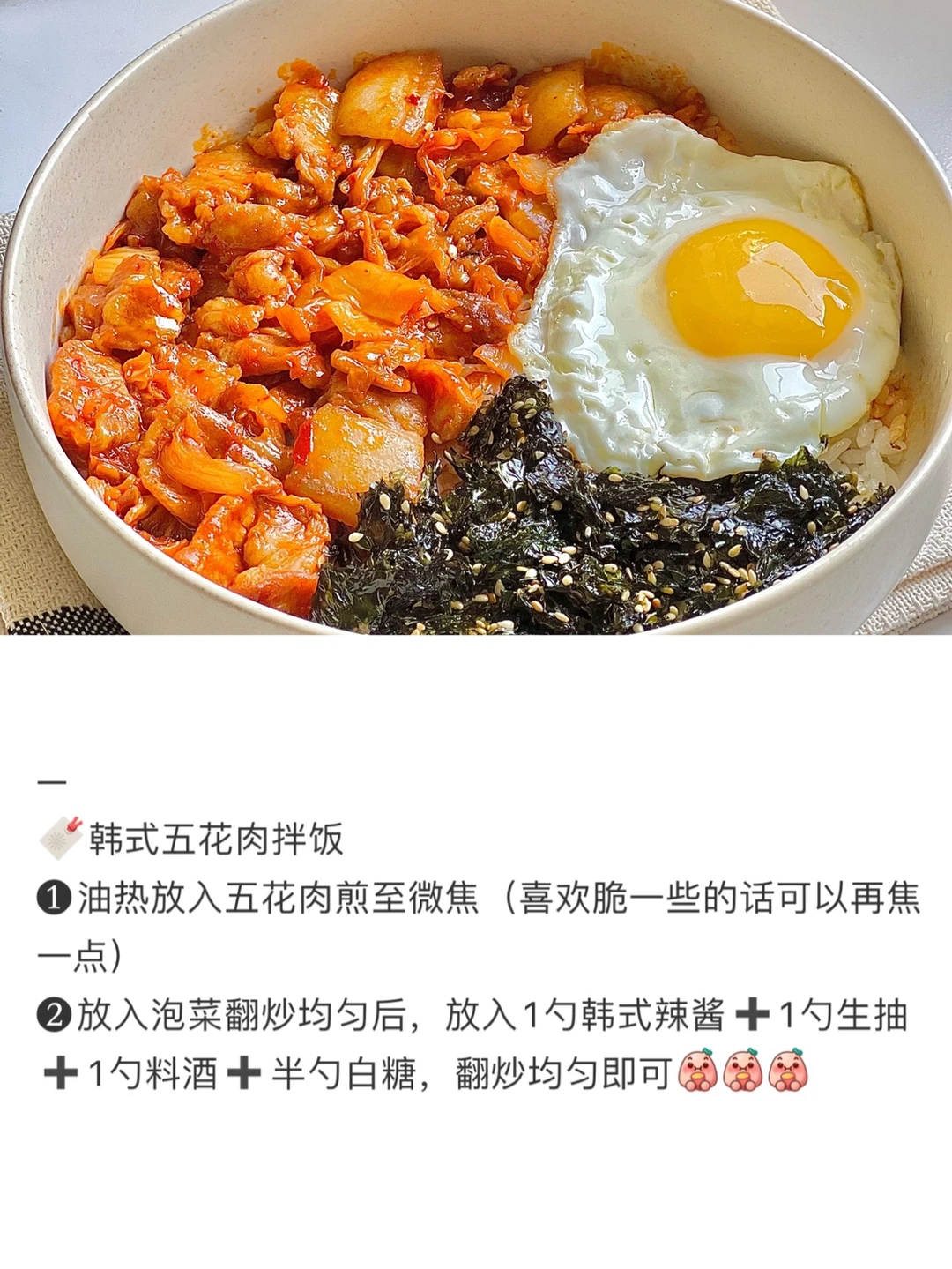 · Hello家人们~周末愉快呀🥳 今天收集了最近比较满意的“作品” 而且每一款都颜值巨高,关键是简单还美味! 需要图片菜谱教程可以翻看之前的笔记📒 — ❶韩式五花肉拌饭(酱汁浓郁酸辣开胃) ❷韩式辣炒乌冬面(简单美味颜值高) ❸龙虾尾拌饭(汤汁浓郁很下饭) ❹照烧肥牛卷(秒杀吉野家)