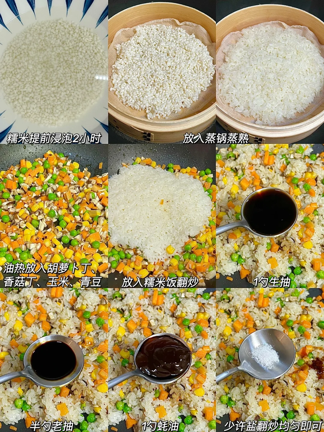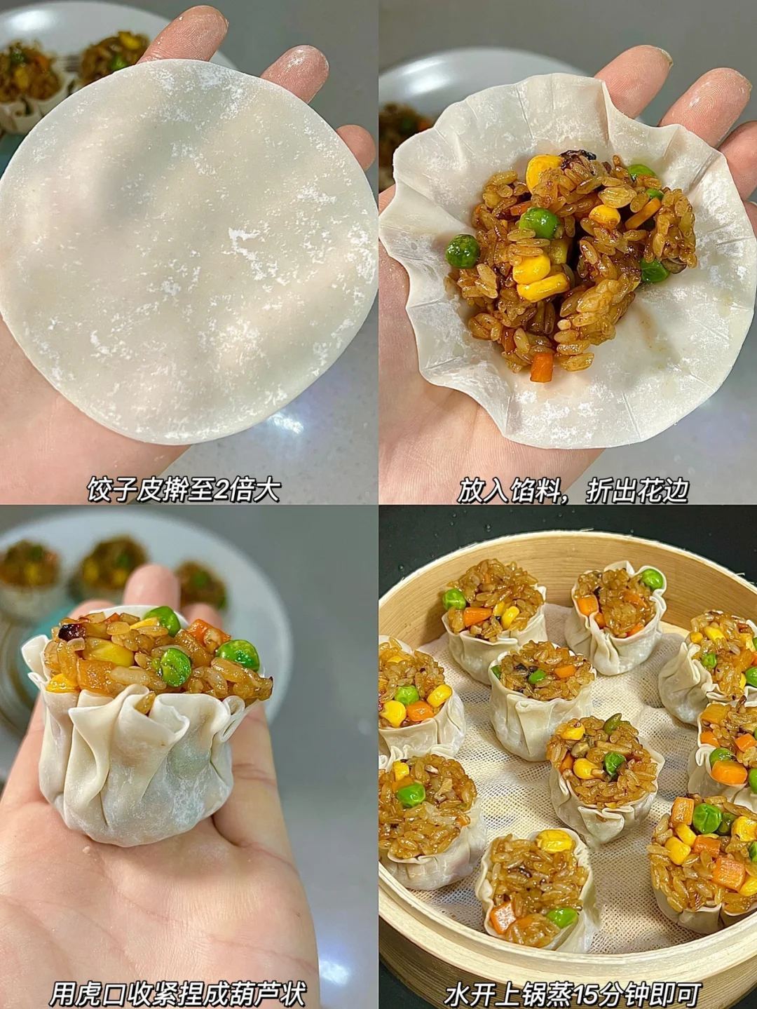 · 一直都很喜欢吃烧麦,每次去早餐店几乎都会买,没想到自己在家也能做而且特别简单,有饺子皮就🉑️,无需揉面,之后早餐有着落啦~ — 🔖糯米烧麦 ❶糯米提前浸泡2小时,然后上锅蒸熟 ❷油热放入胡萝卜丁、香菇丁、玉米、青豆翻炒,再放入糯米饭翻炒均匀 ❸放入1勺生抽➕半勺老抽➕1勺蚝油➕少许盐翻炒均匀即可 ❹饺子皮擀至2倍大,放入馅料,折出花边,用虎口收紧捏成葫芦状(没有擀面杖可以用保鲜膜哦)[暗中观察R] ❺水开上锅蒸15分钟即可🐛