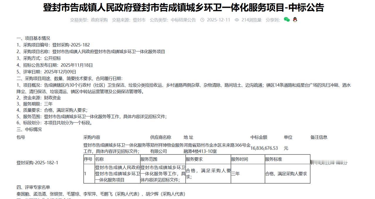登封市告成镇城乡环卫一体化服务项目-中标公告,金额1683.6万元,中标人:郑州
