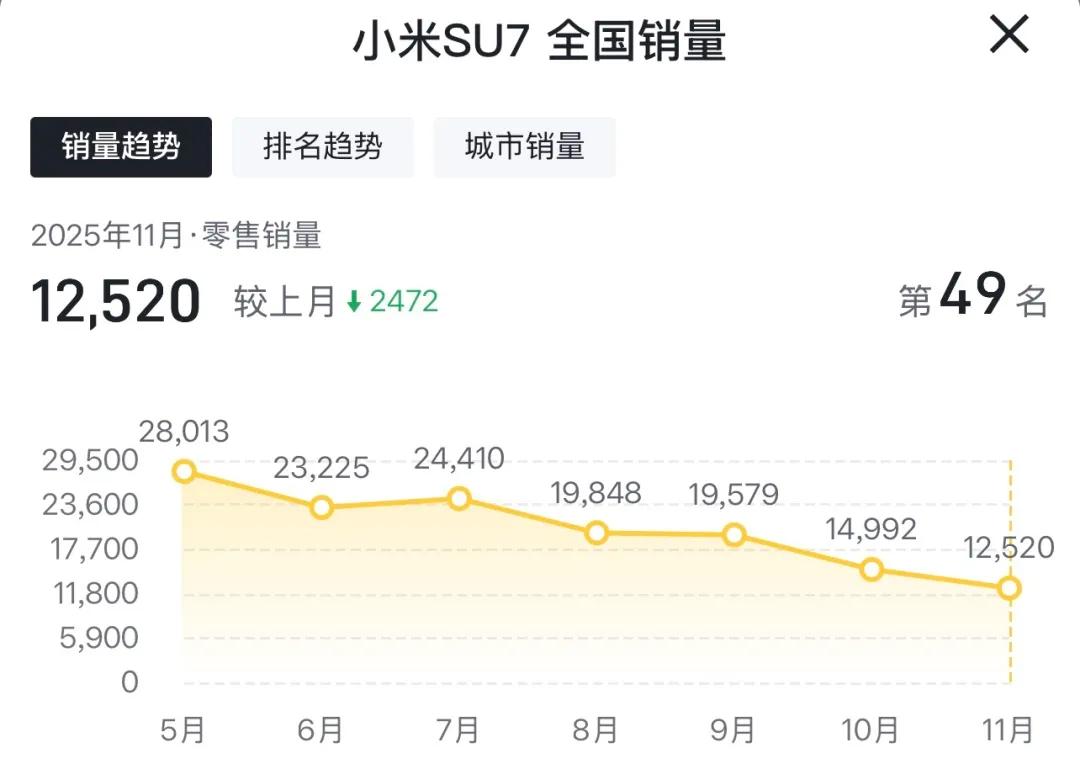 一直关注小米汽车的铁子们最近注意到没有,乘联分会12月8日发布最新数据,小米SU7系列11月合计销量12520辆,连续4个月低于2万辆的同时,还创了2024年6月以来最新低。 在国内纯电轿车市场,小米SU7的月度销量排名还首次跌出前十,由10月的第十位跌至11月的第十三位,分车型统计的总销量更是跌至43位。 貌似小米汽车也迎来了自己的销量瓶颈,尤其此前爆火的小米SU7已经连续多个月销量下滑,年轻人的梦中情车也未免跌势,难免让人唏嘘感慨! 不逃避、不敷衍、不甩锅,遇到问题就去认真分析和积极解决问题,这才是正确的经营方式和处世之道! 小米汽车目前正在遭遇前所未有的“诚意”危机,一系列火出圈的负面新闻让小米汽车深陷舆论泥潭。有的车圈自媒体就认为小米汽车是该拿出足够的诚意出来,毕竟“真诚”才是最好的修复剂和粘合剂,持续地甩锅车主和硬刚媒体长远来看不是太明智哦! 真心希望小米汽车除了营销发力还要及时调整方向,止跌企稳,真诚回应消费者的关注点,重新聚拢人气,行稳致远!