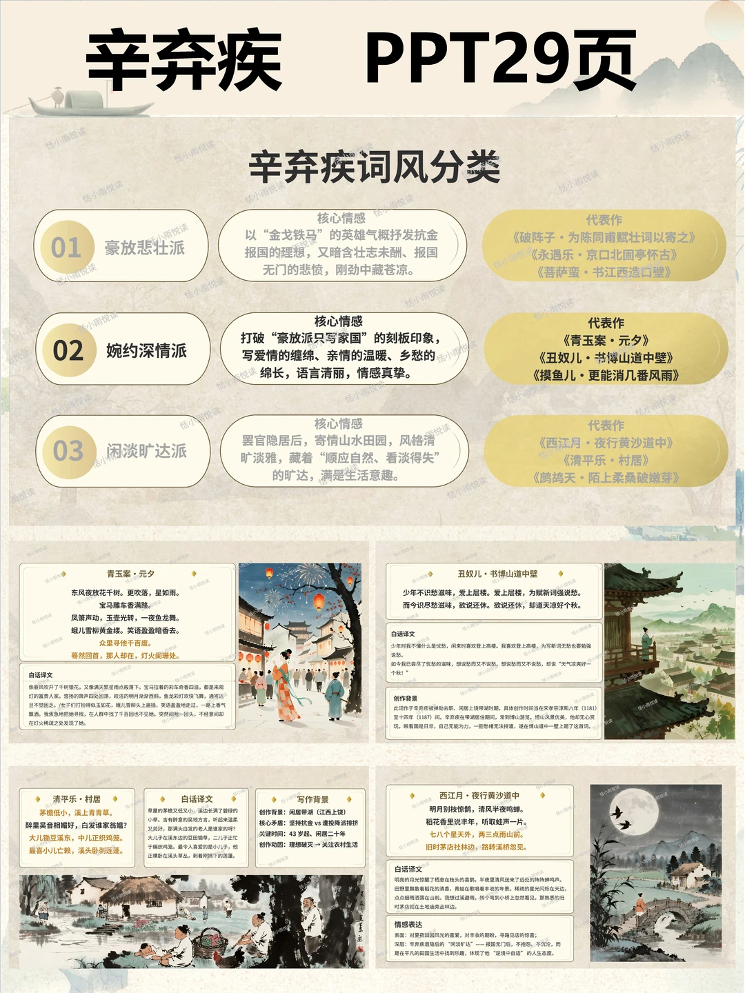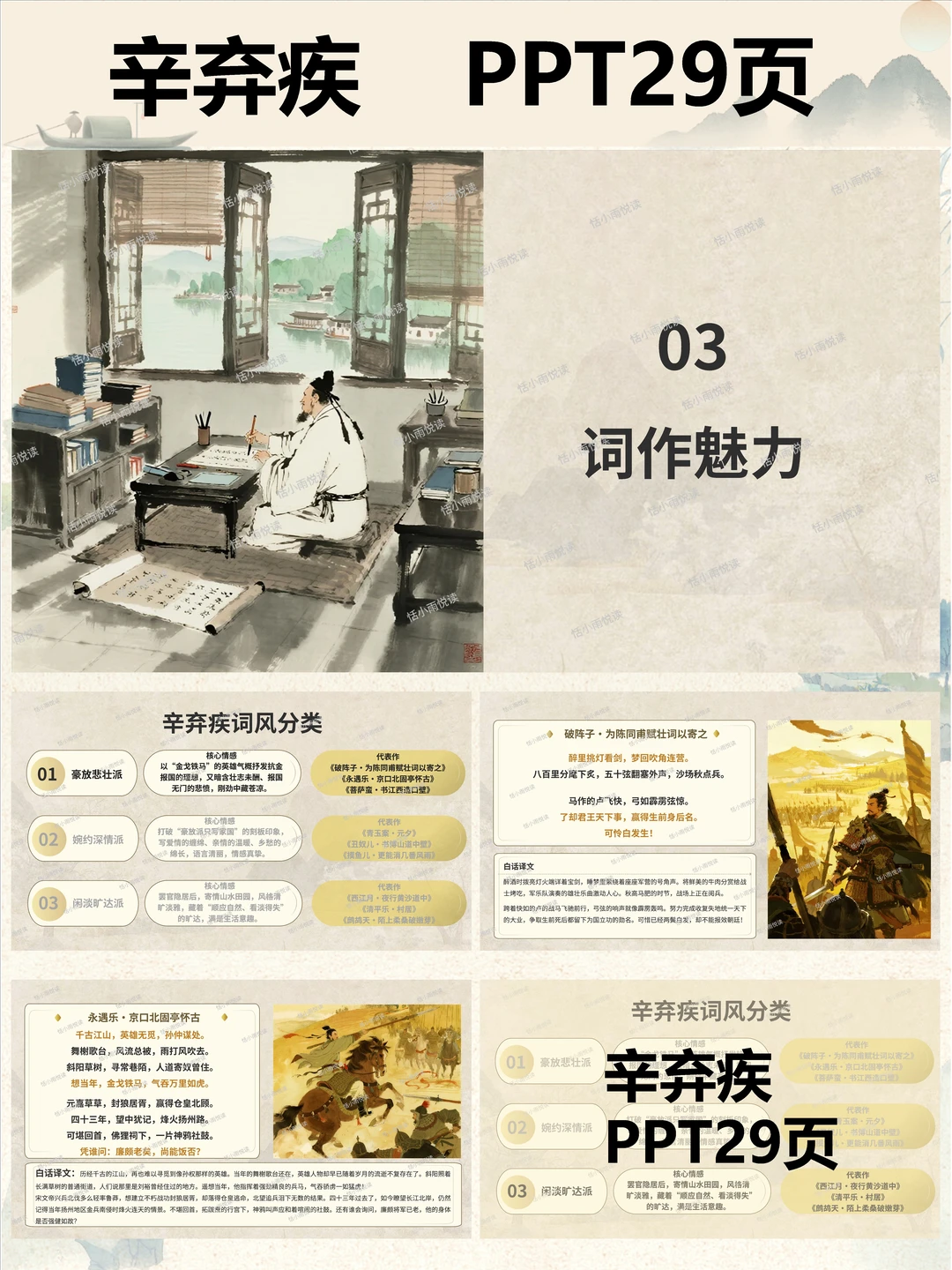 写 “醉里挑灯看剑” 的沙场梦,写 “千古江山” 的沧桑叹。
