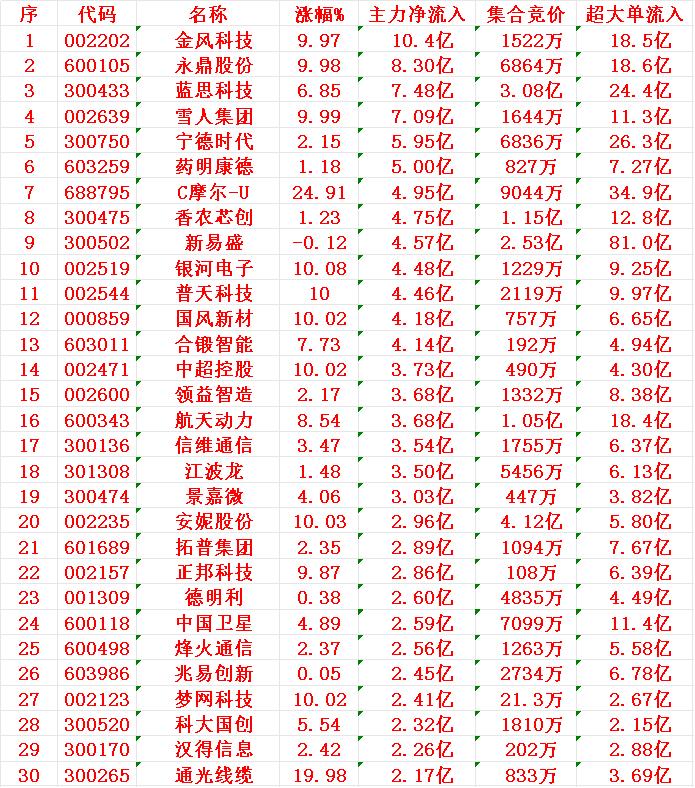 12月11日尾盘30分钟,主力资金“大幅抢筹的”30名单一览! 金风科技(002202):主力净流入 10.4亿元,竞价成交 1522万元 永鼎股份(600105):主力净流入 8.30亿元,竞价成交 6864万元 蓝思科技(300433):主力净流入 7.48亿元,竞价成交 3.08亿元 雪人集团(002639):主力净流入 7.09亿元,竞价成交 1644万元 宁德时代(300750):主力净流入 5.95亿元,竞价成交 6836万元