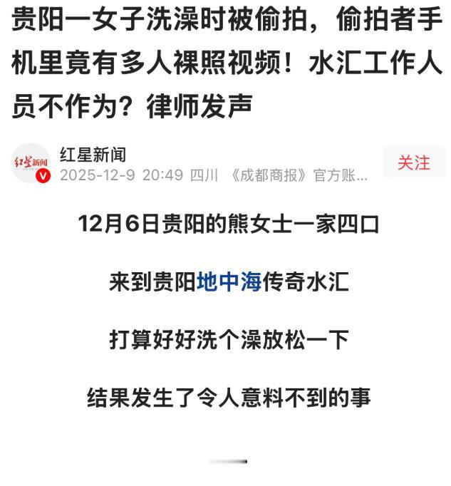 12月6日,贵阳,女子带着家人来到某水汇放松一下,完事后,女子来到淋浴区,一丝不挂的冲澡,期间,不小心将水淋到了旁边的大妈身上了,她赶紧转身道歉,却发现对方偷拍了自己,正准备将裸照发给别人。女子怒了,上去就抢对方手里的手机,双方发生了撕扯。随后,女子报了警,警方发现大妈手机里面有多个女子裸照,以及视频。警方处以大妈7日的行政拘留。事后,女子认为事发时,水汇的工作人员看见了却不制止,有不可推卸的责任,向水汇索赔。结果,水汇的做法让女子失望至极。 本来是带着家人去水汇放松,没成想在淋浴区遭遇偷拍,更让贵阳熊女士心寒的是,争执全程工作人员视而不见,事后店家的处理态度更是让人失望透顶,这事儿最近在网上发酵,不少网友都替熊女士打抱不平。 12月6号,熊女士一家四口来到一家洗浴店消费,蒸完汗蒸后,她到淋浴区冲澡,洗到一半,不小心把水溅到了旁边一位大妈身上,她赶紧转身想道歉,余光却瞥见大妈手里的手机屏幕亮着,凑近一看瞬间懵了:屏幕上全是自己的裸照,大妈正准备点发送! “当时又气又怕,脑子里就一个念头,不能让照片发出去。” 熊女士说,她立刻上前抢夺手机,大妈死死攥着不肯松手,两人当场扭打在一起。 熊女士一边要护着不远处的孩子,一边要和对方拉扯,狼狈不堪,整个争执过程持续了十多分钟,她多次朝着周围呼救,眼角余光看到不远处有三个穿红衣服的水汇工作人员,可他们就站在那里看着,既不上前制止,也不过来询问,完全一副事不关己的样子。 最终熊女士奋力夺下了手机,第一时间报了警,民警赶到后,当场将偷拍的杨某某(化名)带走调查,这一查更是让人脊背发凉:杨某某的手机里不仅有熊女士的裸照,还存着大量其他女性的隐私照片和视频,其中一段29秒的视频里有三位女士全裸出镜,而且已经被她转发给了微信好友。 显然,这不是临时起意,而是有预谋的多次偷拍行为。 最终,杨某某被依法处以7日行政拘留。偷拍者受到了处罚,可熊女士心里的疙瘩并没解开。 她认为,水汇作为经营方,没能保障消费者的隐私安全,工作人员更是失职,理应承担责任,于是向水汇讨要说法。 可水汇的回应让她彻底失望,12月9号,记者陪同熊女士来到水汇沟通,大堂经理不仅否认工作人员 “漠视十多分钟”,还辩称 “顶多三、五分钟,工作人员要巡场,不可能一直盯着”。 对于赔偿诉求,店家只给出了 “免本次门票 + 赠送三张门票” 的方案,完全没提自己的管理责任。 “我要的不是几张门票,是他们正视自己的失职,给我一个合理的道歉和保障!” 熊女士明确拒绝了这个敷衍的方案,并提出了经济补偿诉求,没想到却被水汇告知 “麻烦走正规法律渠道,该赔多少我们再承担”。 这话一出,网友们都炸了,有网友吐槽:“女浴区本该是绝对私密的地方,连基本安全都保障不了,还好意思开门做生意?” 还有人愤怒表示:“工作人员眼睁睁看着顾客被偷拍争执,不制止不帮忙,这就是所谓的服务?” 其实根据法律规定,公共浴室属于隐私保护的 “法律禁区”,经营方负有安全管理和检查义务。 律师也明确表示,如果熊女士能证明水汇存在 “未及时制止、未配合调查” 等情况,店家就可能要承担补充责任。 而且消费者在经营场所消费时,店家有义务保障其人身和财产安全,包括隐私安全,工作人员眼睁睁看着侵权行为发生却不干预,显然没尽到应尽的义务。 现在,熊女士已经做好了通过法律途径维权的准备,这场风波也给所有经营公共洗浴、住宿等场所的商家提了个醒:隐私安全不是小事,不能只挂在嘴边,更要落实到行动上。 工作人员的培训、现场的巡查监管,每一个环节都不能缺位。 对消费者来说,遇到偷拍这种事也别慌,要像熊女士一样果断报警,保留好证据,用法律武器维护自己的合法权益。 毕竟,每个人的隐私都值得被尊重和保护,经营方更不能用几张门票就想打发了事,只有真正正视责任、守住底线,才能让消费者放心消费。 对此你怎么看? 信源:法治进行时