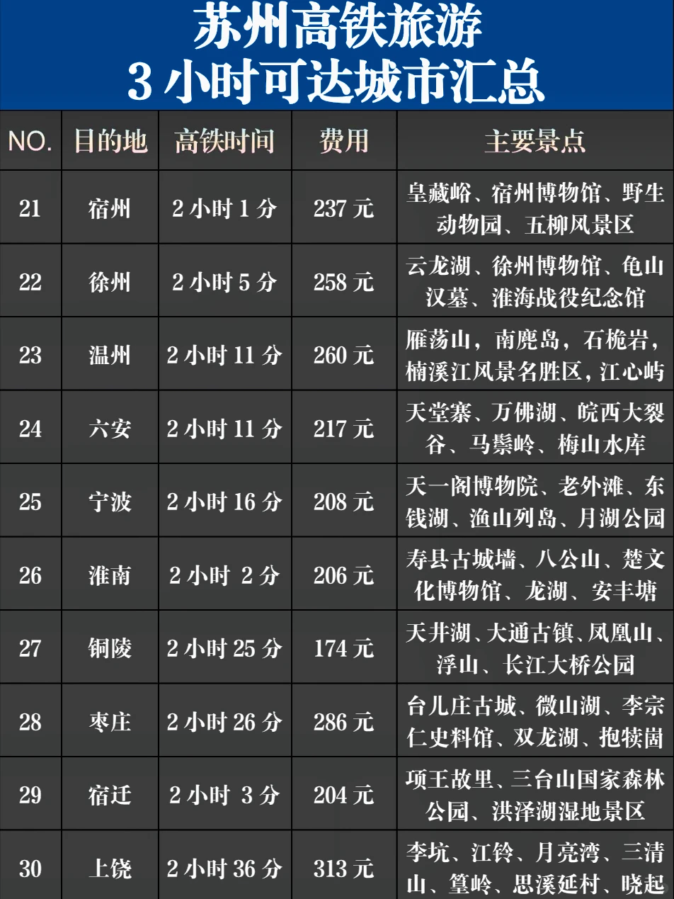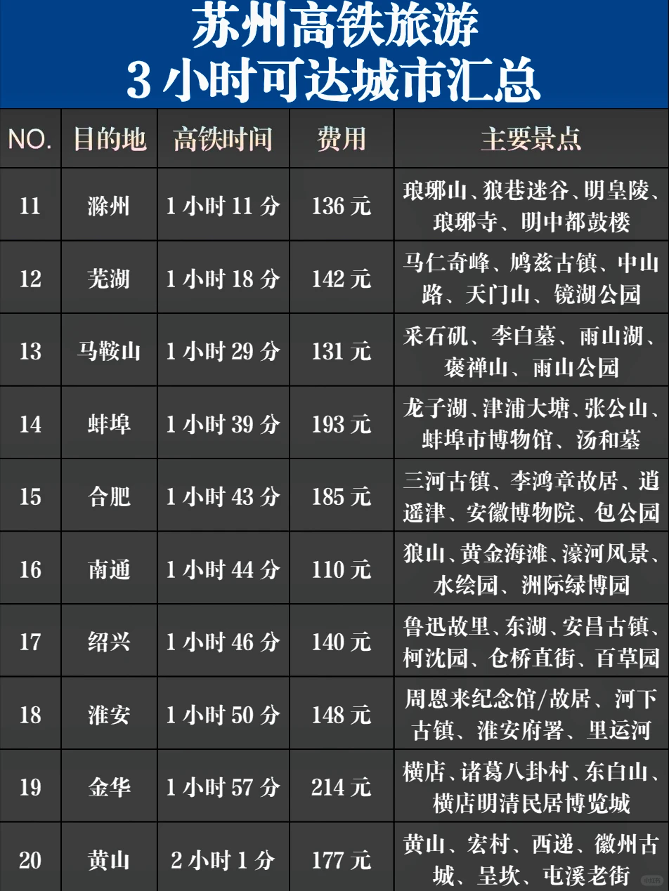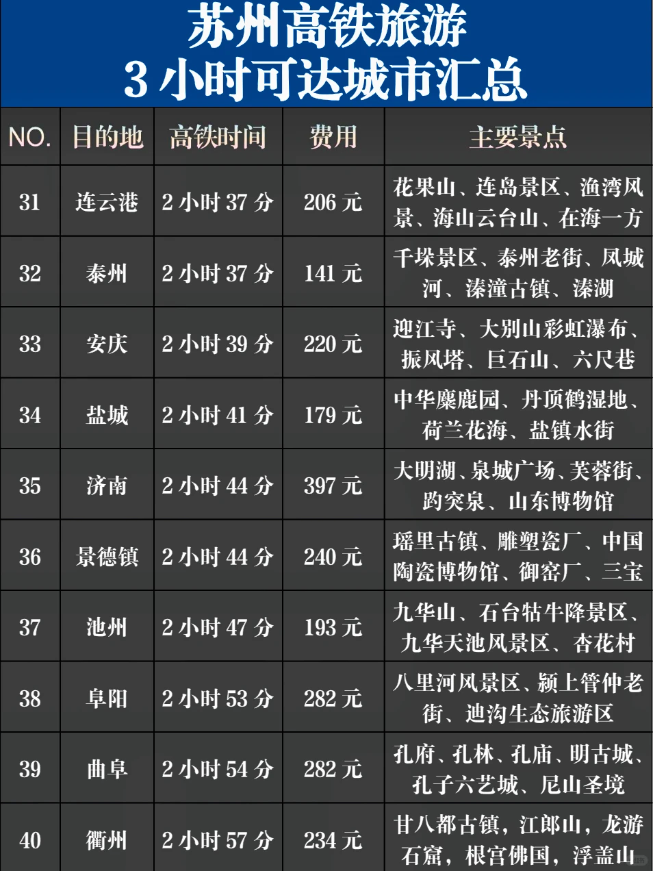 苏州乘高铁出发,3小时可以去哪儿玩? 这份高铁出行可达城市汇总表告诉你答案! 兄弟姐妹们,周末和节假日都给我冲😊😊😊