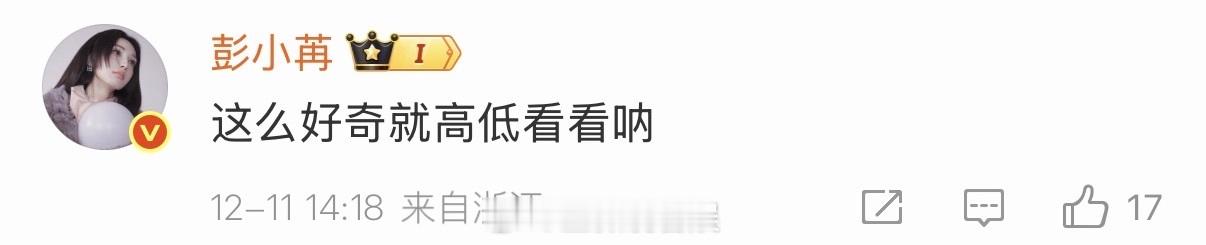 彭小苒 这么好奇高低看看呐 有人点评彭小苒的演员之路,把“好奇她功底”挂嘴边,却坦言没看过作品,这不就是没依据的空谈?还好姐姐一句话戳破:“这么好奇高低看看呐”,清醒又不呛人,太会了!彭小苒