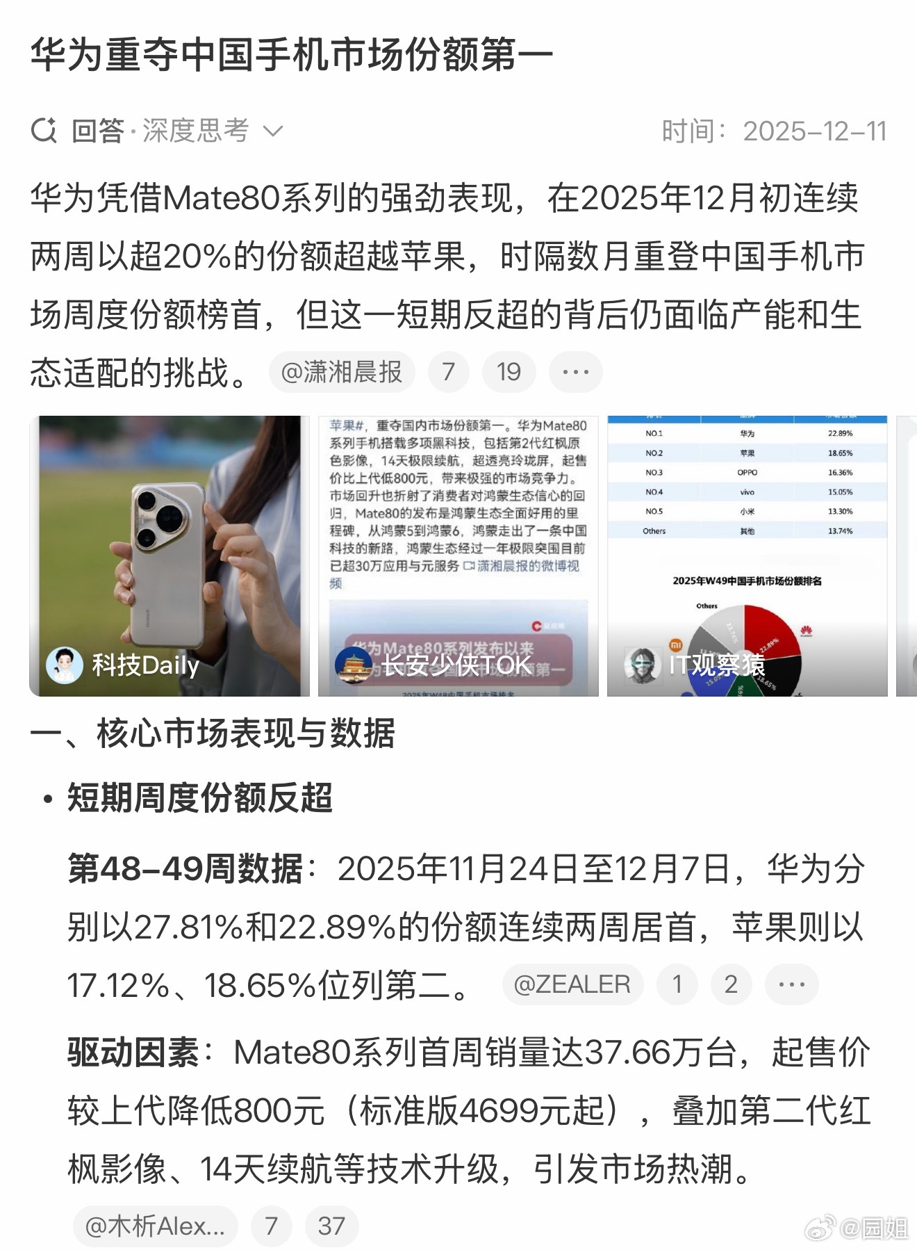 #华为重夺中国手机市场份额第一#华为Mate 80这一代的表现非常出色,加上生态建设的不断完善和鸿蒙的表现,这个数据只会越来越好,建议大家有空都去实体店体验下~