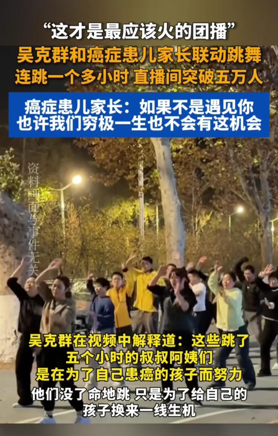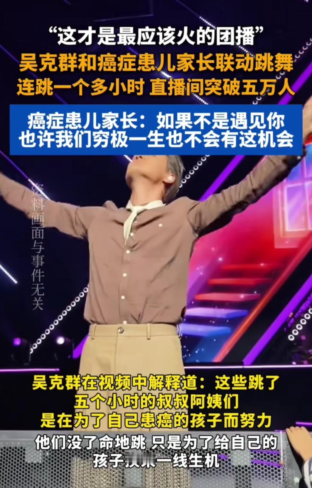 刷短视频时突然被一段跳舞视频戳中——不是舞台上的劲歌热舞,而是歌手吴克群和一群癌症患儿家长挤在病房走廊,跟着简单旋律笨拙摇摆,镜头里的笑脸藏着掩不住的疲惫。 没人想到,这位平时站在聚光灯下的歌手,会花时间连线抗癌父母直播间,陪着他们聊深夜的崩溃、化疗的煎熬,这次更是亲自到场,用最朴素的舞蹈给每个家庭打气。 流量时代,太多人把“顶流”和数据挂钩,但吴克群让我们看到:真正的影响力,从来不是粉丝多寡、热度高低,而是愿意把聚光灯分给普通人,用微小的善意照亮困境里的人。流量向善才是真顶流,这样的明星,值得被更多人看见。