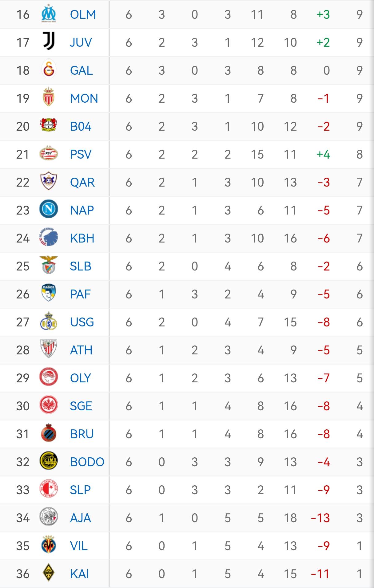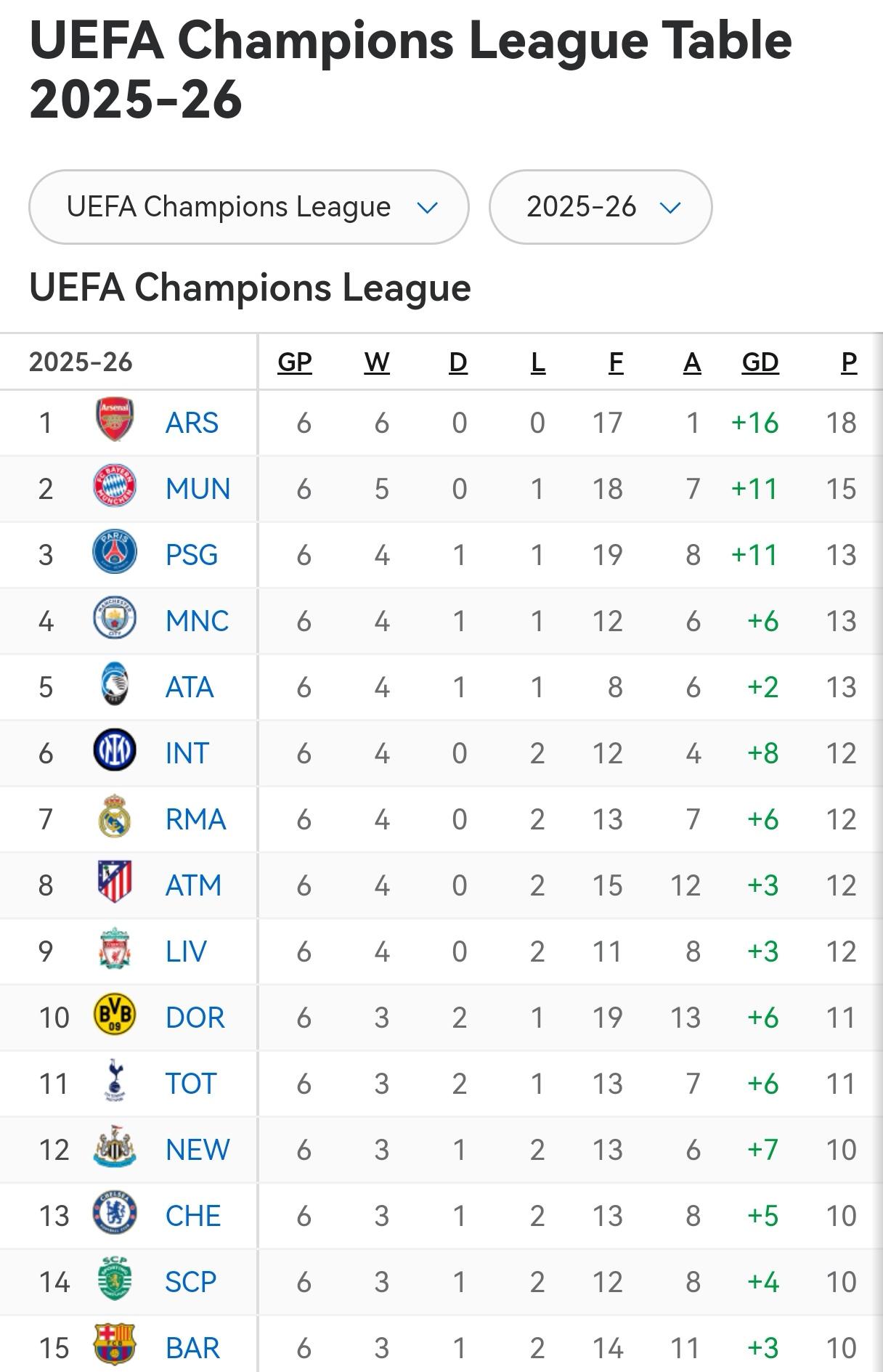 随着新一轮欧冠联赛的结束,欧冠最新积分榜出炉!本赛季状态火热的阿森纳和拜仁分别排在第一和第二位,紧随其后的是卫冕冠军大巴黎和瓜迪奥拉带领的曼城!如果你认真观察目前的积分榜,你会发现正如穆里尼奥所说现在的欧冠非五大联赛的球队几乎不可能获得冠军了! 从最新积分榜我们可以看到,直接晋级欧冠淘汰赛区内全是五大联赛的球队,淘汰赛附加赛区里非五大联赛球队也只有五支, 他们是葡萄牙体育、加拉塔萨雷、埃因霍温、卡拉巴赫和哥本哈根,考虑他们的后续赛程,这五支球队很难获得直接晋级淘汰赛的名额,而如果参加附加赛的话他们中最终能晋级淘汰赛的估计也就一两支,这就意味着在欧冠淘汰赛阶段已经很难见到非五大联赛的球队了! 本赛季欧冠赛场最让人兴奋的球队无疑是六连胜的阿森纳,他们不仅在英超领跑,在欧冠赛场同样位居第一!另一支表现不错的球队是“真蓝黑”亚特兰大,虽然本赛季在意甲赛场表现有些糟糕,但他们在欧冠赛场证明了自己,先后战胜了马赛、法兰克福和切尔西!最让人失望的球队则是那不勒斯,他们再次证明了自己是“内战内行,外战外行”,做为意甲冠军在欧冠赛场仅仅取得了两场胜利,本轮更是输给了本赛季状态不佳的本菲卡!巴萨的表现也难令球迷满意,赛季开始时很多人都认为他们是欧冠冠军的有力争夺者,但他们的实际表现和球迷的期望明显有一定差距! 欧冠小组赛还有两轮,要到明年一月才开始,各支豪门俱乐部有足够的时间进行调整,但也有可能让自己火热的状态变凉,不管怎么说,欧冠的比赛还是很值得球迷去期待的!