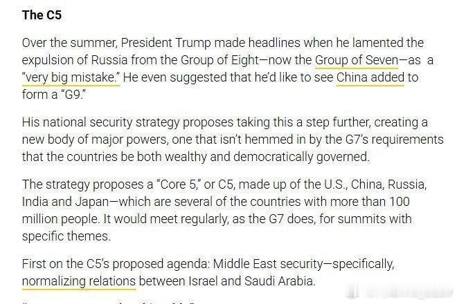 最新消息:美国正在探索组建“核心五国”的可能性据Defense One报道,美国正在探索组建一个由中国、俄罗斯、印度和日本组成的五国联盟的可能性,以共同应对全球挑战。Defense One(国防一号)援引了近期发布的美国国家安全战略的扩展版本。Defense One报道称:“该战略提议建立一个‘核心五国’(或称C5),成员包括美国、中国、俄罗斯、印度和日本——这五个国家的人口均超过1亿。”预计欧盟不会参与。